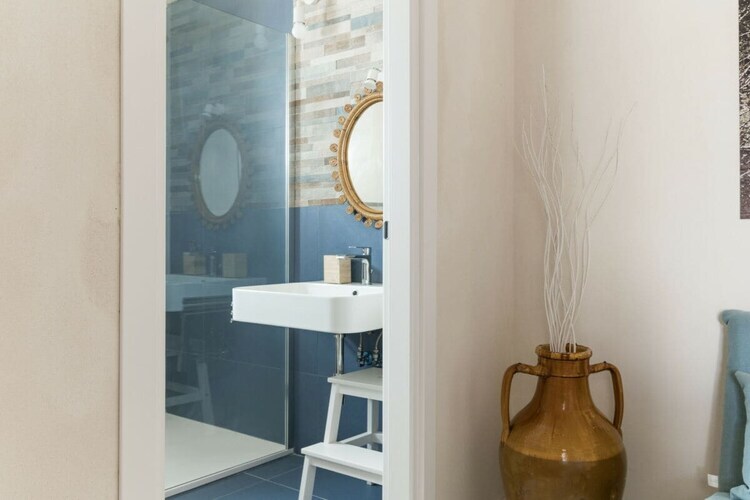 Quelques marches plus loin se trouve la première chambre avec un lit double et une télévision. Cette partie de la maison est complétée par une salle de bain complète avec douche à l'italienne et une petite buanderie.