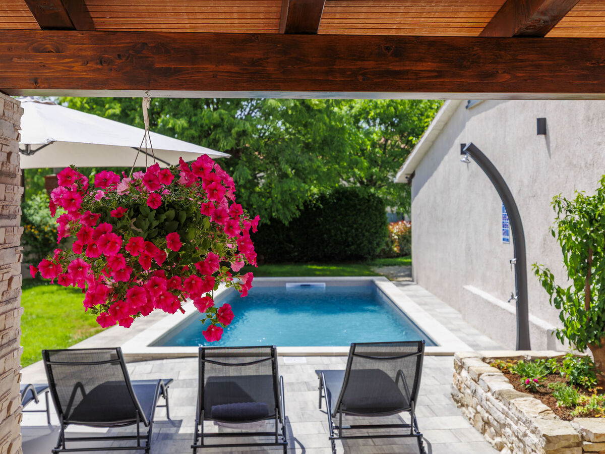 Douche extérieure, entretien de la piscine par le propriétaire/jardinier.
