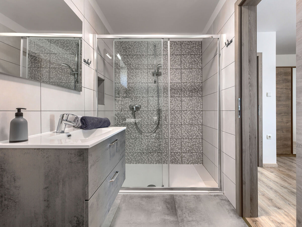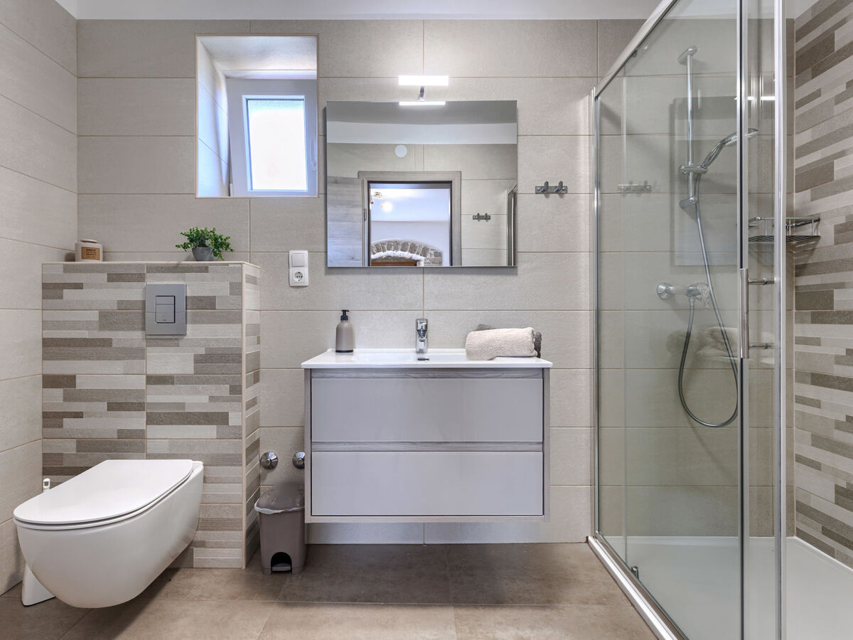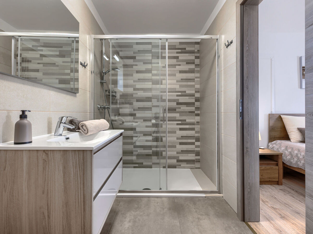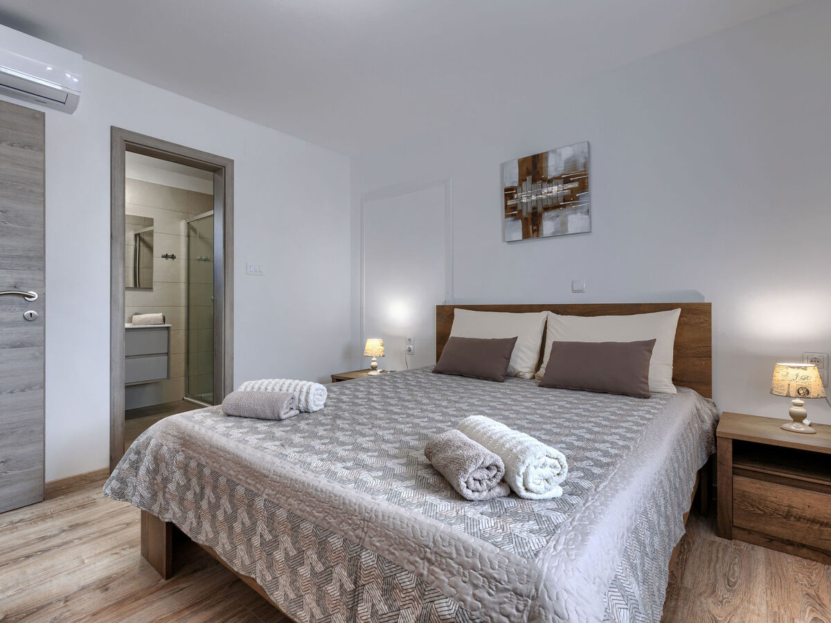 À l'étage supérieur: 2 chambres, chaque chambre avec: 1 grand-lit (160 cm, longueur 200 cm), douche/WC et air-conditionné.