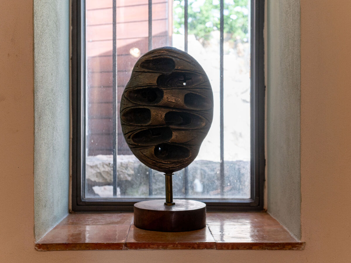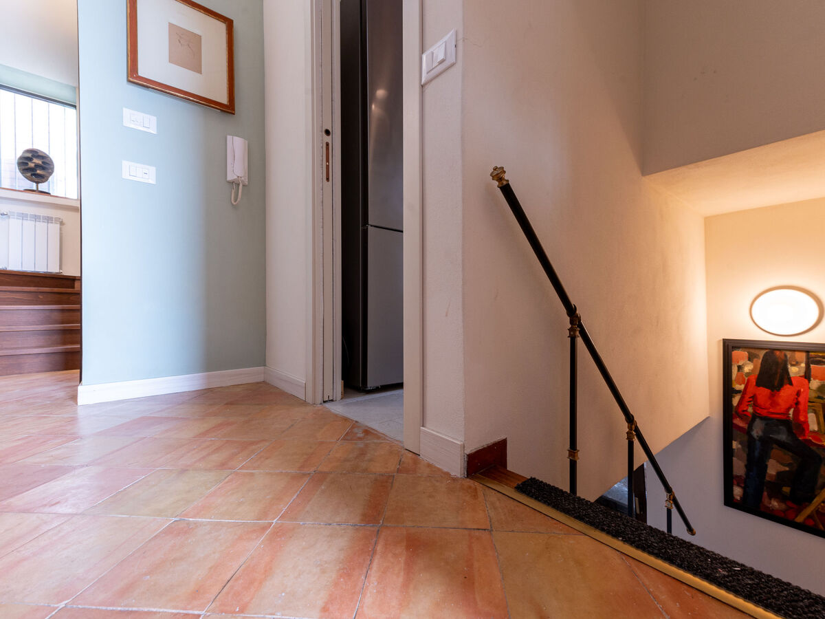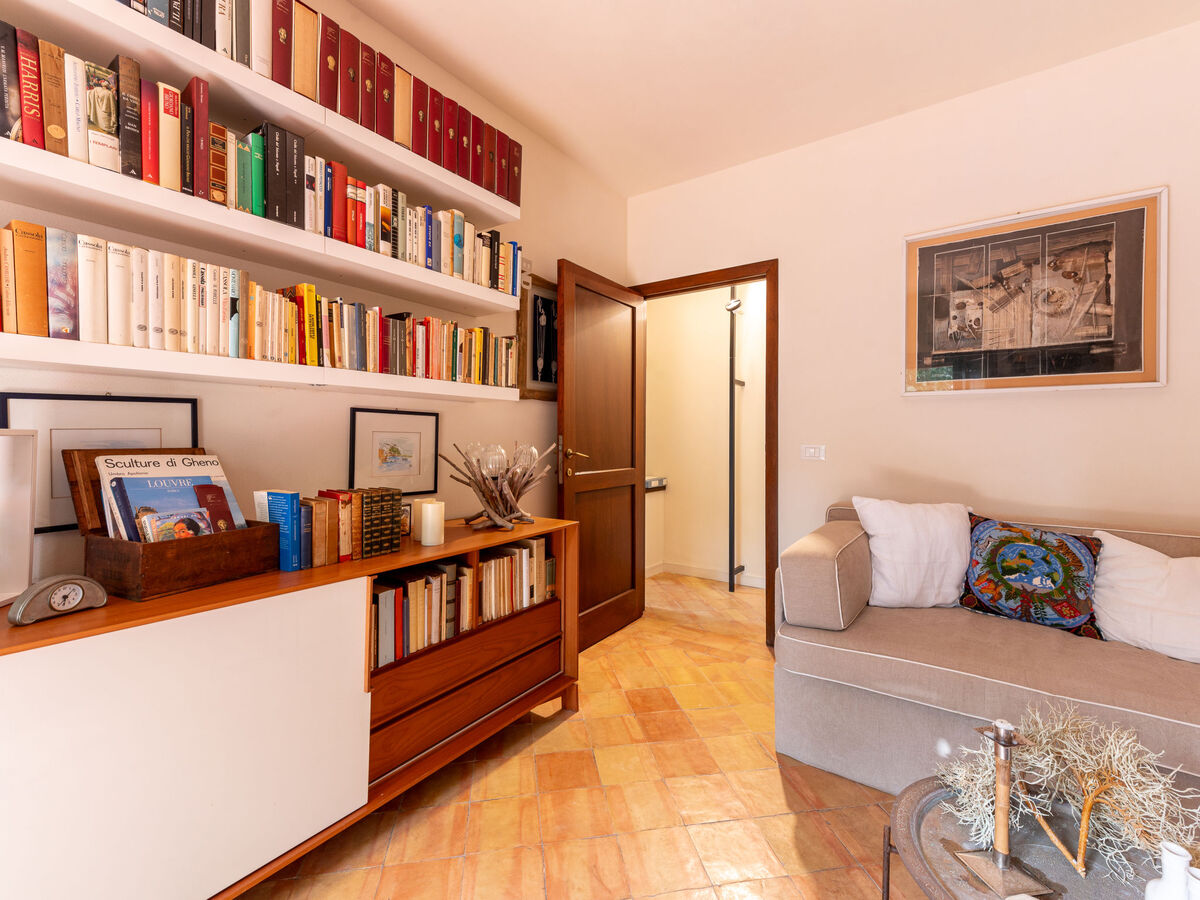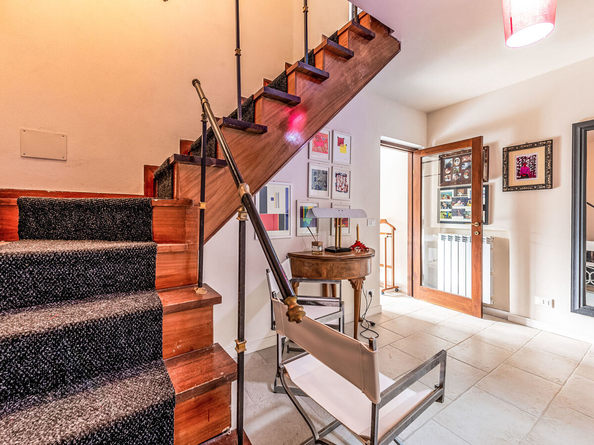 Le mobilier a été personnellement choisi par la maîtresse de maison, les peintures et les sculptures proviennent d'une collection privée de la galerie d'art familiale, l'éclairage a été soigneusement conçu avec des lampes de designer (Flos Artemide Fontana Arte) contrastant avec les meubles de brocantage et les tissus naturels.