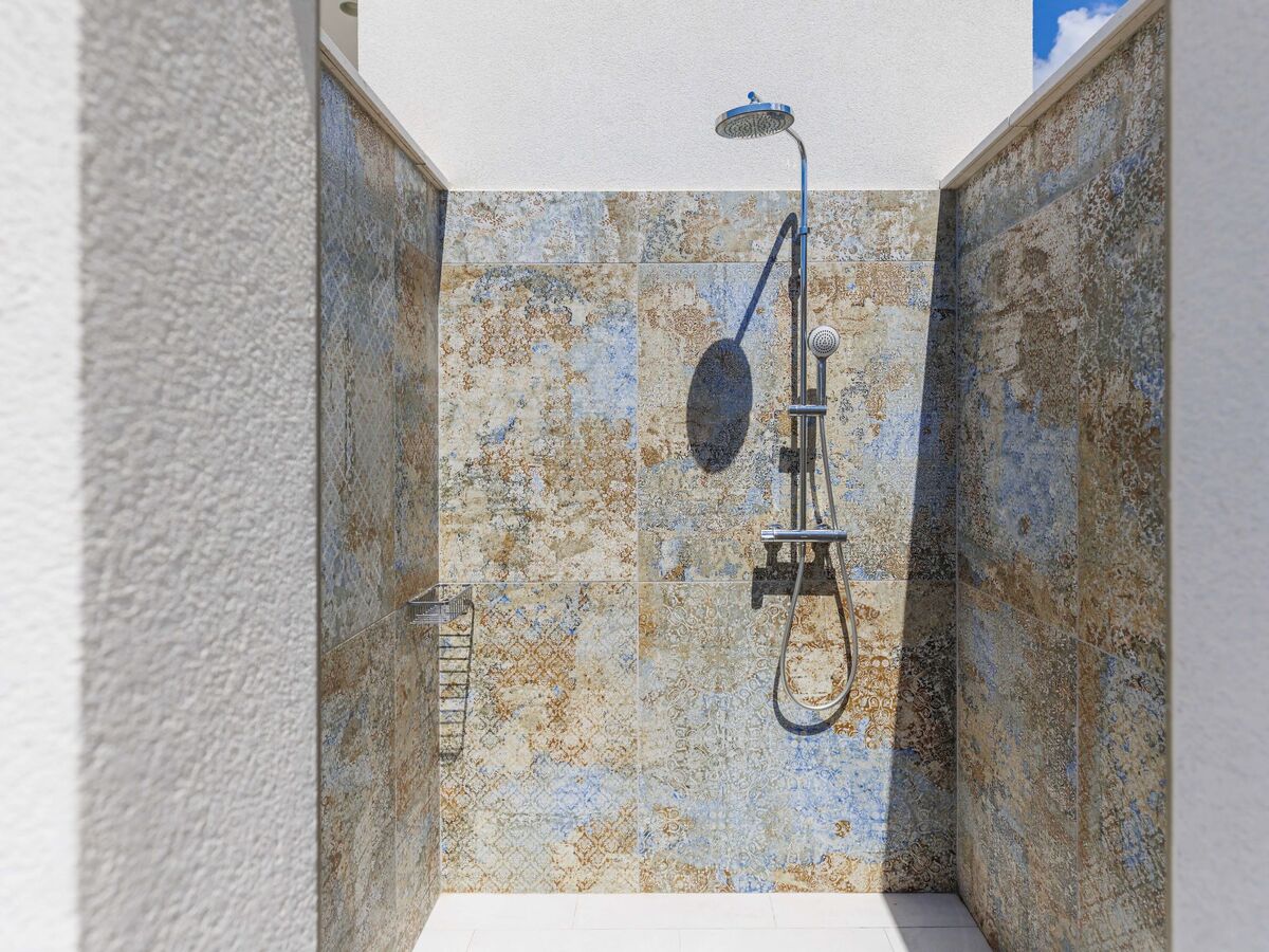 Douche extérieure, terrasse (15 m2), meubles de jardin.