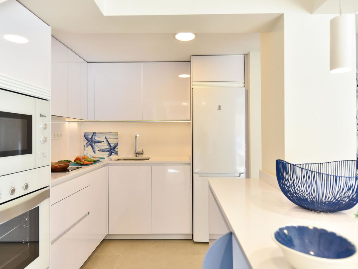Cuisine/séjour (four, lave-vaisselle, grille-pain, bouilloire électrique, micro-ondes, cafetière électrique) avec table pour les repas.