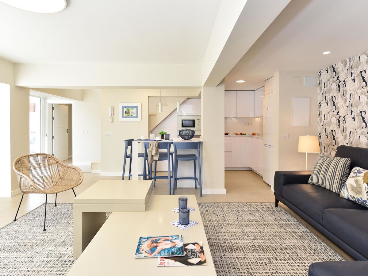 Cuisine/séjour (lave-vaisselle, grille-pain, bouilloire électrique, micro-ondes, cafetière électrique) avec table pour les repas.