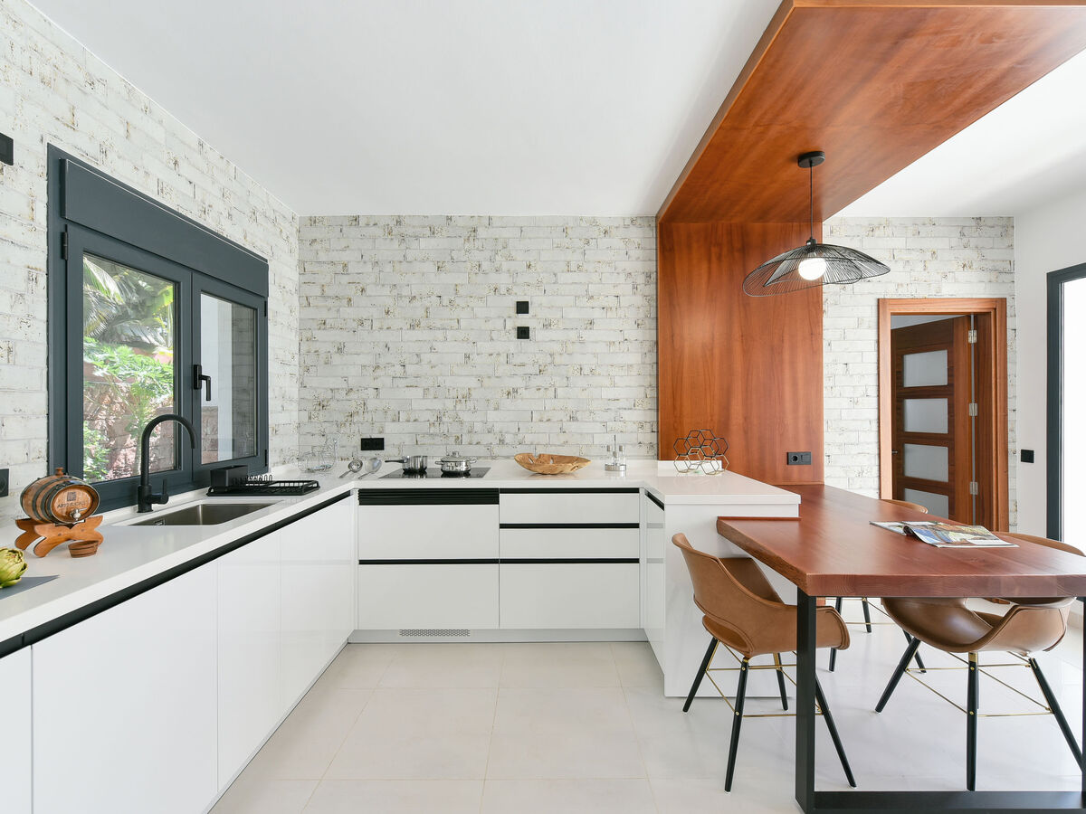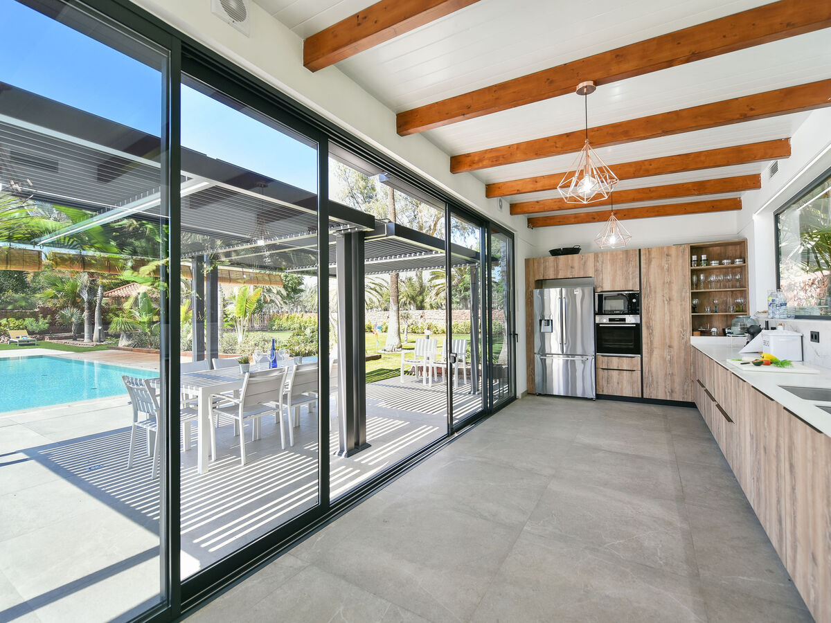 Grande cuisine (four, lave-vaisselle, grille-pain, micro-ondes, congélateur) avec air-conditionné.