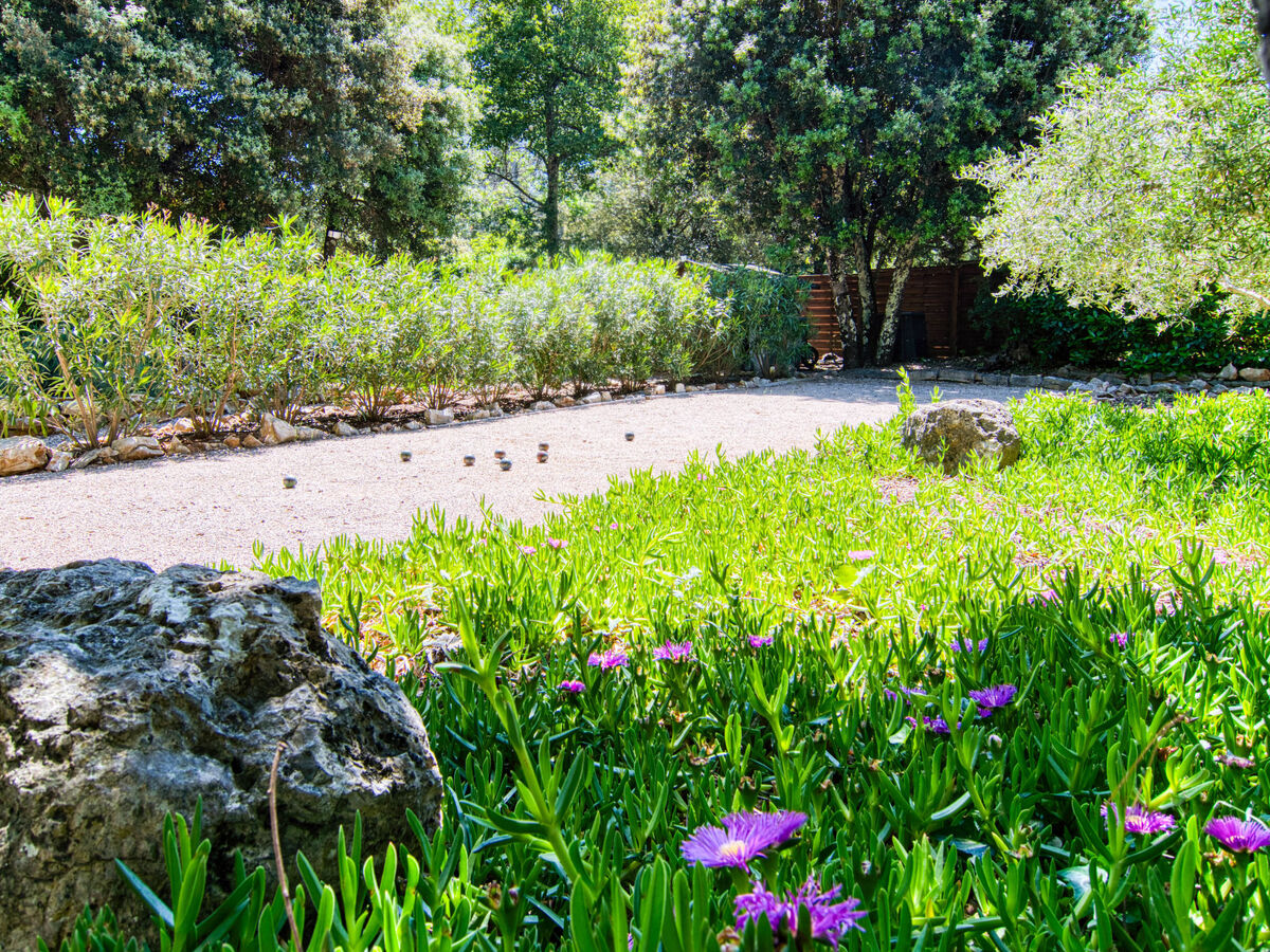 Douche extérieure, terrain de pétanque, place de parking (pour 4 voitures) sur le terrain.
