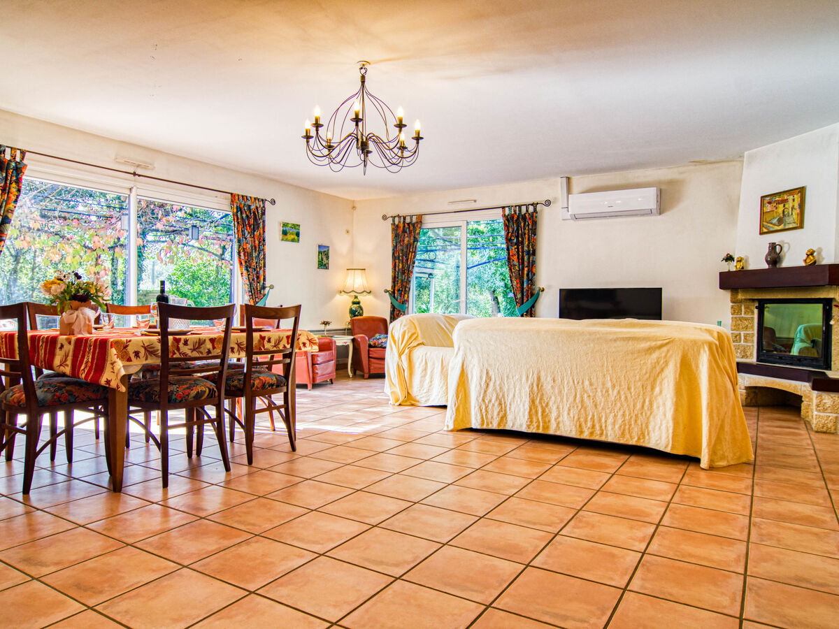 Séjour/salle à manger avec cheminée (uniquement à titre de décoration), table pour les repas et TV (écran plat), air-conditionné.