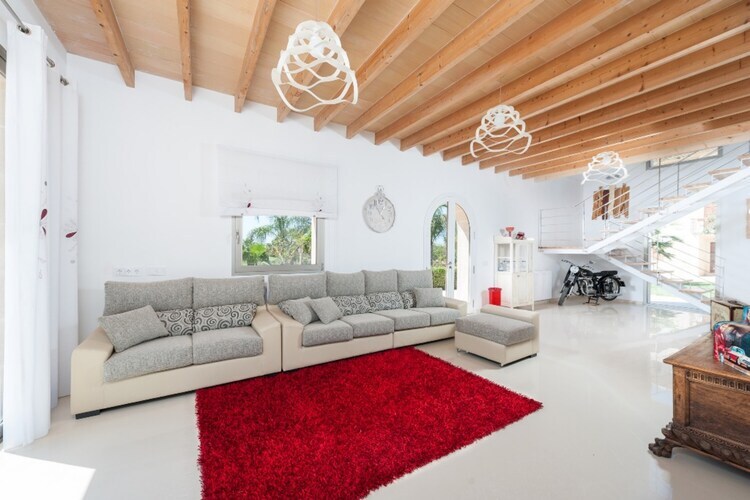 El interior de la casa, de dos plantas, les hará sentirse como en su propio hogar gracias a su combinación de relajante blanco y variedad de madera, sus toques de color, y sus elementos decorativos tan peculiares como la moto Rieju, totalmente restaurada, bajo el hueco de la escalera.