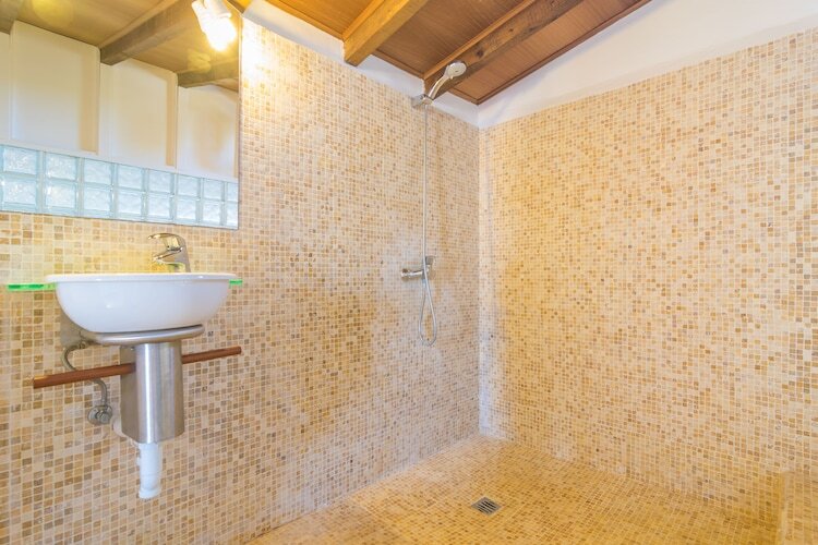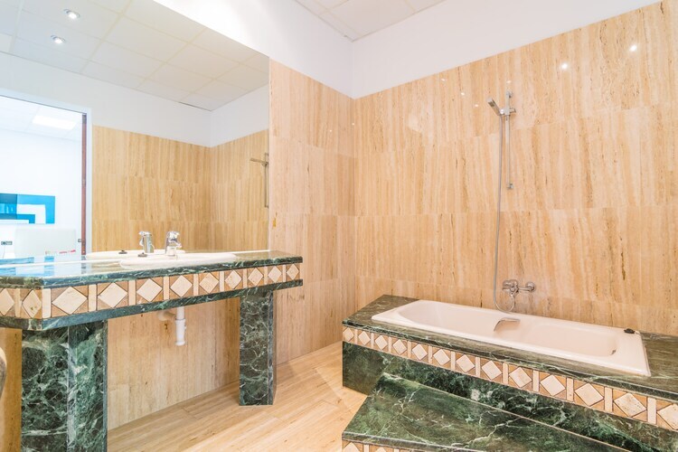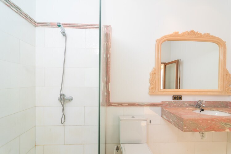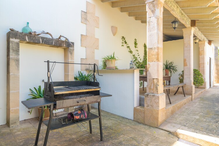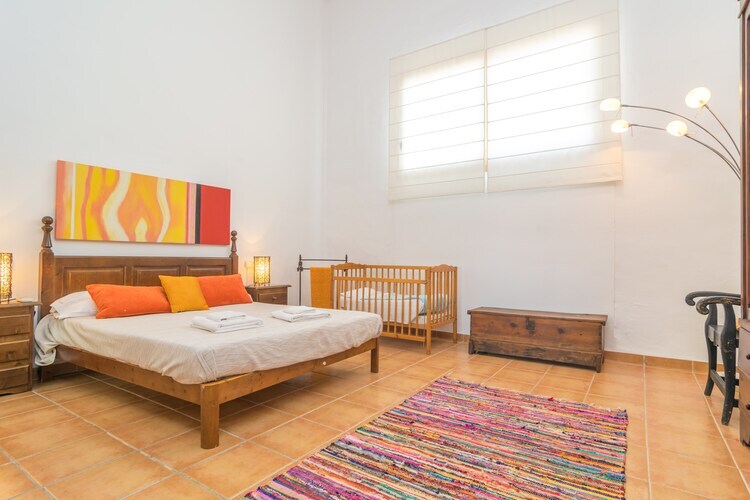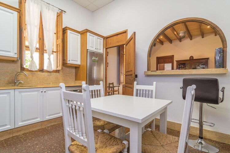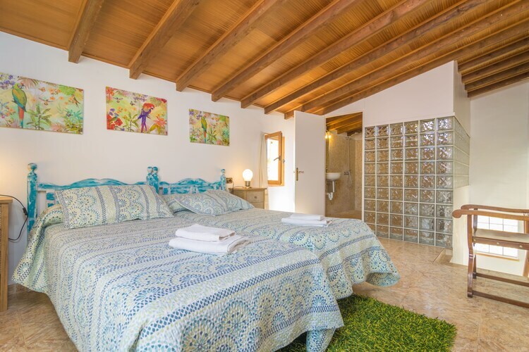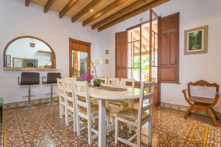 La casa de 244m2 distribuidos en dos plantas tiene mucho encanto ya que es una casa tÃpica mallorquina con elementos modernos de la cual se han conservado los azulejos hidráulicos. Dispone de cinco dormitorios, cuatro en la PB, dos con cama de matrimonio y dos con dos camas individuales, de los cuales uno dispone de aire acondicionado y baño en suite; y uno en la 1ª planta con cama de matrimonio, aire acondicionado y baño en suite. De los dormitorios situados en la PB, hay dos en los cuales se accede des de una puerta exterior, no tienen acceso directo en el interior de la casa; además también hay dos dormitorios separados entre sà por una cortina. Hay disponibilidad para una cuna y una trona. Además de los dos baños en suite, hay un baño con ducha en la planta 1 que da servicio a toda la casa.