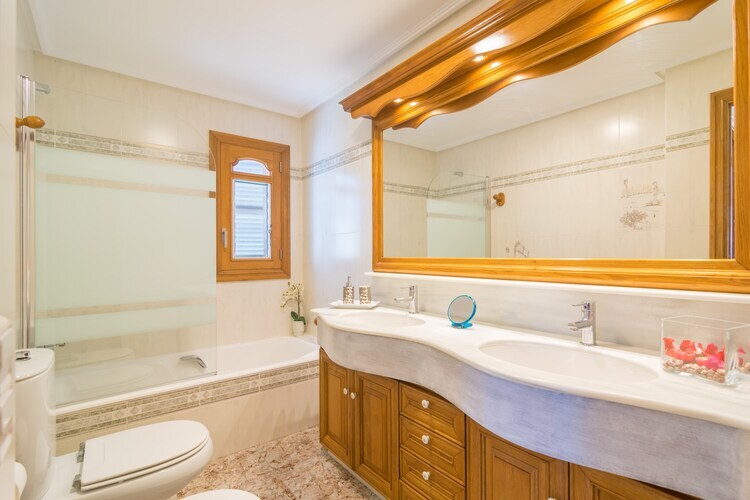 La casa distribuye sus estancias en 2 plantas. Abajo, el salón-comedor dispone de dos sofás, una mesita, TV-SAT, A/C y una moderna mesa de comedor. La cocina ofrece vitrocerámica, A/C y lo necesario para cocinar. La planta se completa con una habitación con cama doble y dos baños con ducha. Arriba tienen otro baño con bañera y tres habitaciones más, dos con cama doble y una con dos camas individuales. Dos de ellas tienen salida a la terraza superior. Los 4 dormitorios tienen armario y A/C. Hay cuna y trona disponibles. Hay lavadora, plancha y tabla de planchar.