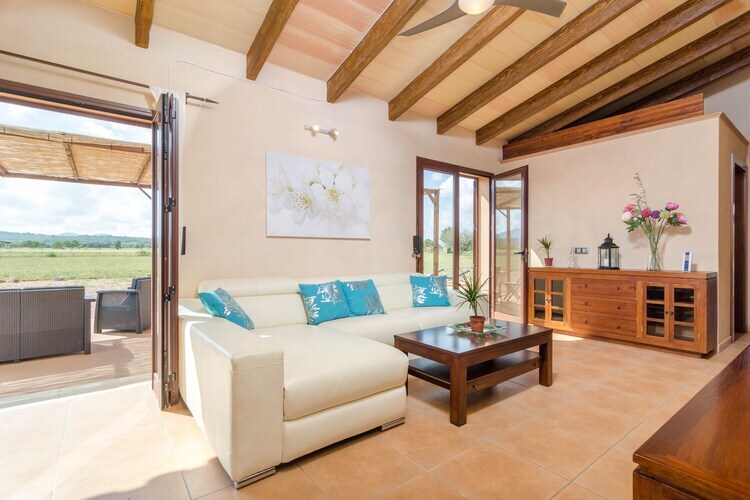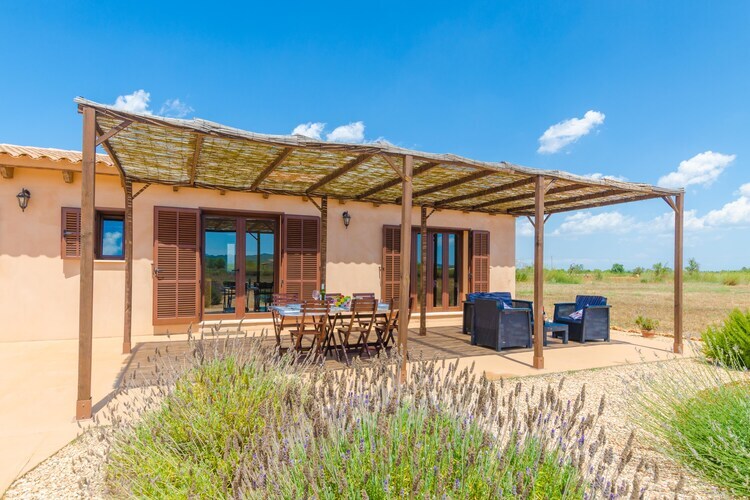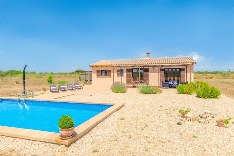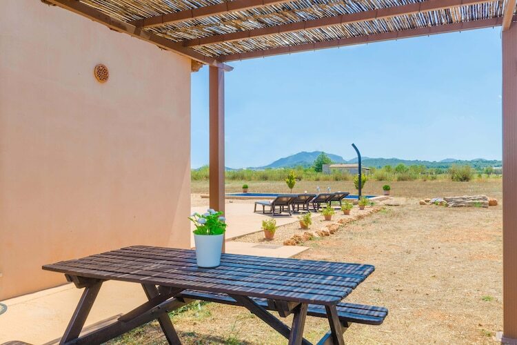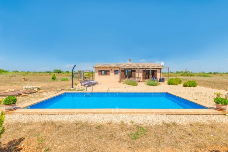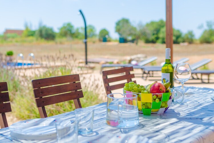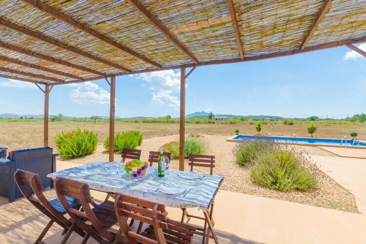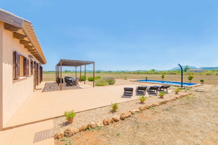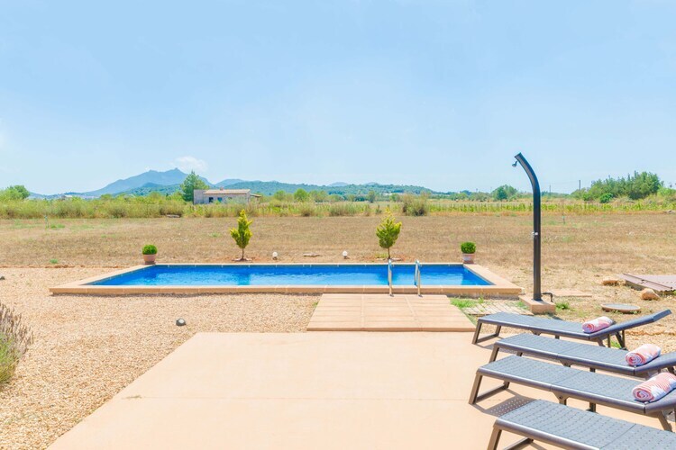 Nuestros huéspedes podrán refrescarse en la piscina privada de cloro, con unas dimensiones de 8.5 m x 4 m y una profundidad de 1.3 m. Rodeada por una zona de grava y césped muy bien cuidado, ofreciendo cuatro hamacas y una ducha exterior, es un sitio bonito para disfrutar del sol mallorquÃn. La terraza está protegida por un toldo de paja, dónde pasar momentos románticos en pareja mientras contemplan las vistas despejadas al campo. Si les gusta cocinar fuera, podrán hacer una barbacoa bajo el cielo azul. Esta encantadora villa es independiente, está totalmente vallada y privada.