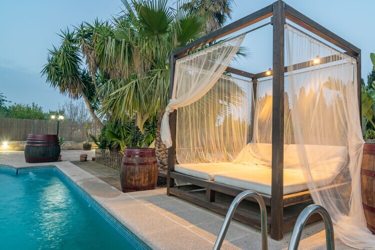 En el porche con vistas a la piscina de sal, de 8x4m y 0.80 a 2.50m de profundidad, pueden disfrutar de auténticas veladas acompañados de una sabrosa cena preparada en la gran plancha. Alrededor de la piscina disponen de hasta dos tumbonas para tomar el sol.