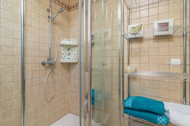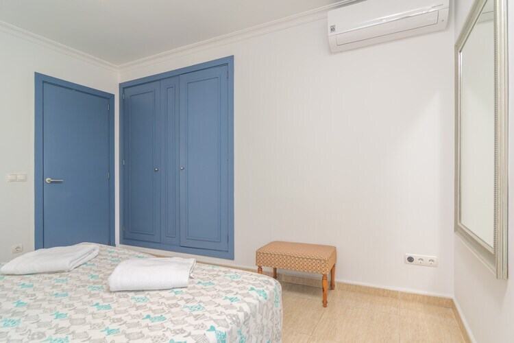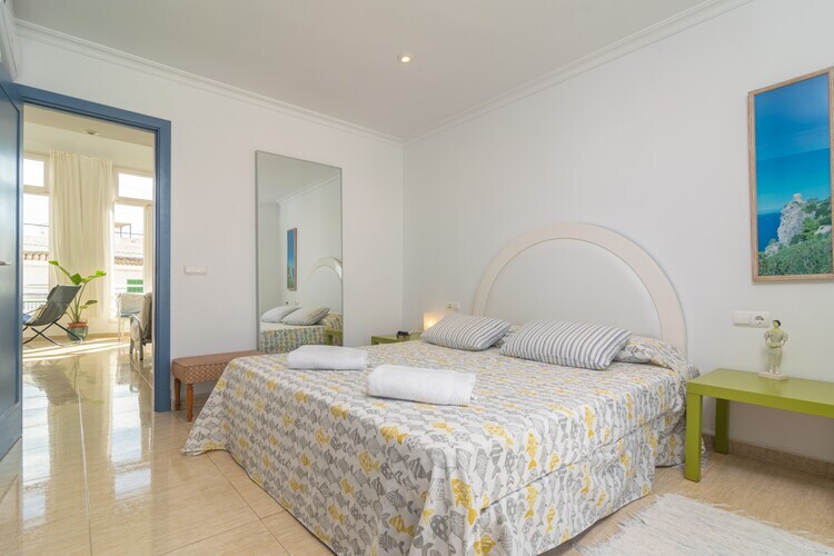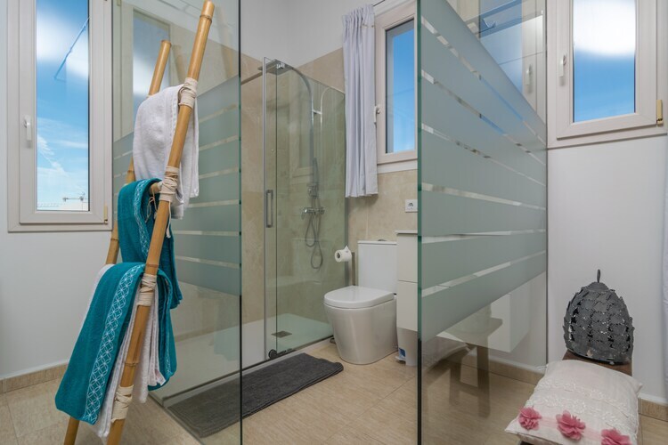 Au même étage, il y a deux chambres, toutes deux avec lits doubles, climatisation et accès au balcon. Une salle de bain avec douche se trouve également à cet étage. Un lit bébé et une chaise haute sont disponibles sur demande. La buanderie est équipée d'un lave-linge, d'un fer et d'une planche à repasser. La troisième chambre, accessible par un escalier en colimaçon, est spacieuse mais offre une intimité limitée car il s'agit d'une mezzanine. Elle dispose également de la climatisation et d'une deuxième salle de bain avec douche à l'étage.