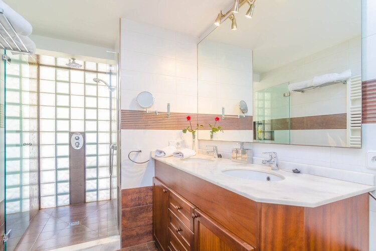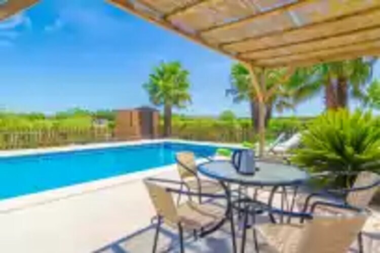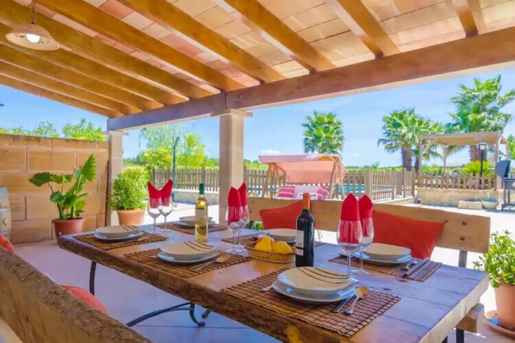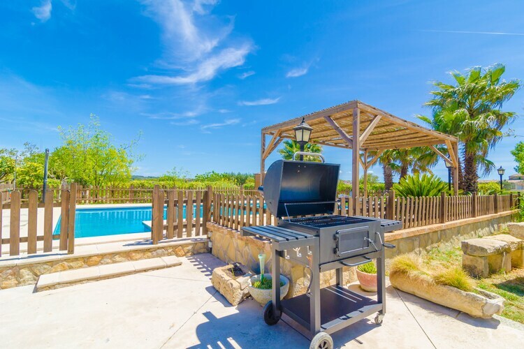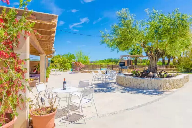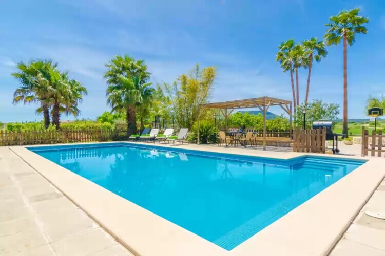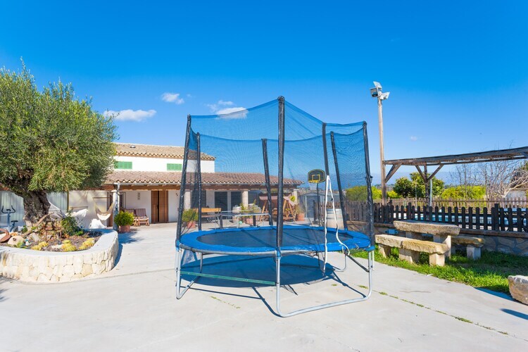 En esta preciosa casa de estilo rústico pero actual vas a disfrutar del ambiente campestre del interior de Mallorca pero estando realmente cerca de todo. En el exterior encontramos una impresionante piscina de cloro que hace 12 x 5 metros y tiene una profundidad de 0,7 a 1,9 metros. Está rodeada por una hermosa terraza con varias mesas y sillas en las que poder tomar el vermut del medio dÃa y con hamacas donde poder tomar cómodamente el sol. Desde la terraza accedemos a la zona aporchada amueblada con sofás y antiguas mecedoras restauradas desde donde disfrutar de la puesta de sol, y una rústica y original mesa en la que comer o cenar al aire libre los deliciosos platos cocinados en la barbacoa que está a su disposición. Para los más inquietos, hay una mesa de ping-pong, una cancha de basquet, una cama elástica y hasta una sauna. La finca de 3400 m2 se encuentra vallada, y aunque hay algunos vecinos en los alrededores, la privacidad es total.
