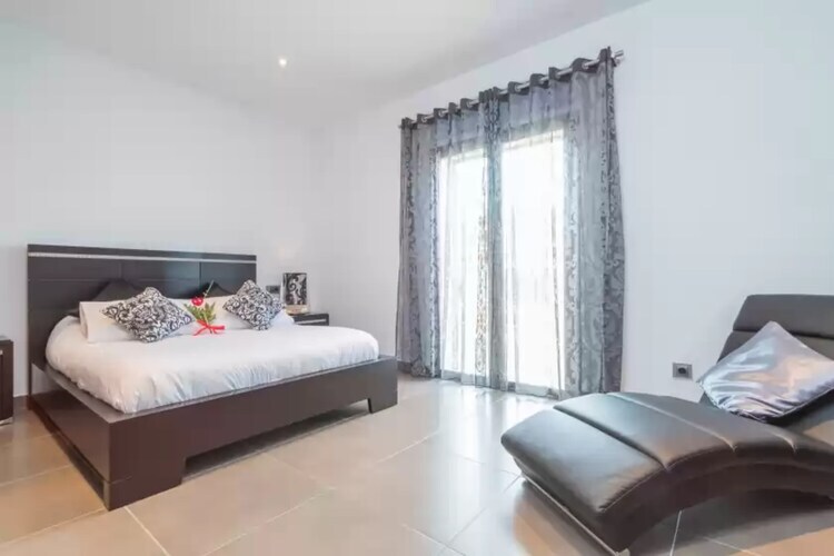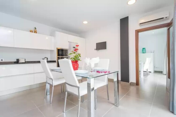 Par de grandes portes vitrées coulissantes, vous accéderez à la cuisine idéale pour les amateurs de cuisine, équipée d'une plaque de cuisson vitrocéramique, de la climatisation et d'un bar convivial. Le salon, également climatisé, comprend une méridienne, la télévision par satellite et un coin repas, idéal pour se détendre après une longue exploration de l'île. La chambre dispose d'un lit double, d'un grand placard, d'un lit bébé et d'une chaise haute, ainsi que d'une salle de bain attenante avec douche et baignoire. Une deuxième salle de bain avec douche, lave-linge, sèche-linge, fer et planche à repasser se trouve à l'extérieur. Ventilateurs et radiateurs disponibles sur demande.