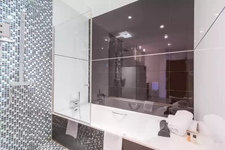 Salle de séjour, cuisine(plaque de cuisson, cafetière/percolateur, four), chambre(lit double), salle de bains, salle de bains, 2x garage, micro ondes, lave-vaisselle , combinaison réfrigérateur/congélateur, baignoire, douche, douche, lavabo, lavabo, WC, WC, barbecue, lit d'enfant, chaise haute