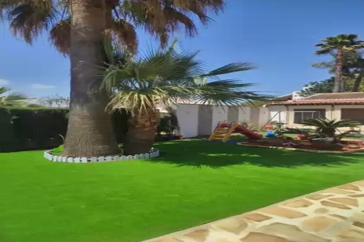 Los exteriores son maravillosos. Una gran extensión de verde césped, que envuelve toda la casa y la piscina, hace que sea el lugar perfecto para sentarse o tumbarse al solecito mientras leen un libro o escuchan algo de música. Aunque también para ello tienen hasta 4 tumbonas alrededor de la piscina. Ésta es de cloro, cuenta con 8 m de largo x 4 m de ancho, una profundidad de 1.10 m hasta 2 m y una ducha al aire libre. Bajo el porche, el cual puede cerrarse, encuentran una fantástica barbacoa de obra para que puedan comer todos juntos y pasar la tarde mientras los pequeños de la familia juegan en los columpios. Además frente a la entrada de la casa tienen una terraza cubierta con un largo toldo para tomar un té o un café tranquilamente.