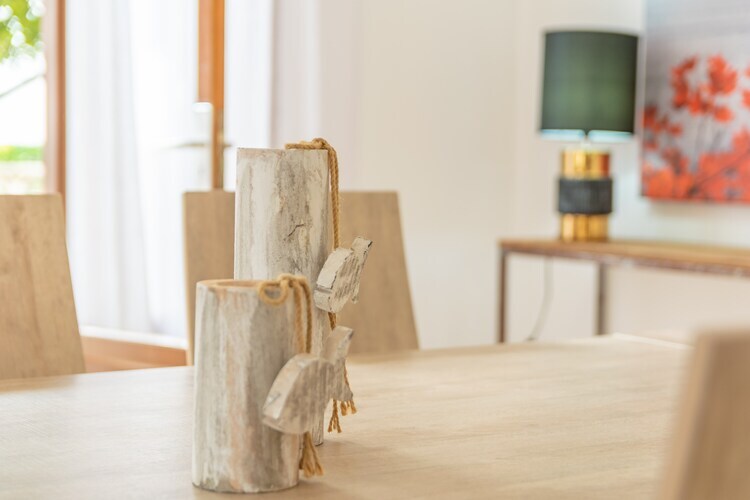 La casa de 2 plantas ofrece un estilo acogedor con todo lo necesario para disfrutar de las vacaciones. Está dividida en 2 plantas y en cada una de ellas encontrarán: una gran sala comedor con TV y salida al porche o a la terraza, que conecta con la cocina - equipada con fogones de gas- a través de un cómodo arco; dos dormitorios, uno con cama doble y el otro con 2 camas individuales; y un baño con ducha. Todos los dormitorios tienen aire acondicionado. A la primera planta se accede desde el exterior y a la terraza solarium superior por la primera planta. La casa está equipada con lavadora, plancha y tabla para planchar y podemos preparar una cuna y una trona si viajan con su bebé.