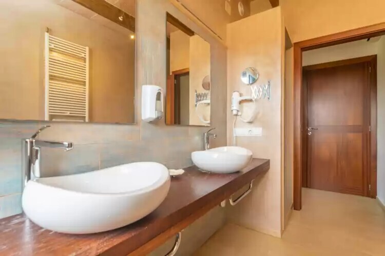 À l'intérieur, la maison de deux étages est décorée avec goût pour allier confort et élégance. Le rez-de-chaussée comprend un spacieux salon climatisé et télévision par satellite, un coin repas et une cuisine entièrement équipée avec plaques à induction. Quatre chambres sont réparties sur ce niveau, chacune avec climatisation et salle de bain attenante : deux avec lit double et baignoire balnéo, et deux avec lits jumeaux et douche. Au rez-de-chaussée, un deuxième salon et une cinquième chambre avec salle de bain attenante et climatisation offrent un espace supplémentaire. Des articles de toilette pour bébé et une buanderie sont à disposition.