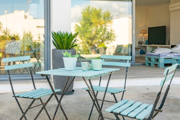 En la tranquila localidad de Son Serra de Marina encontramos esta maravillosa villa, perfecta para darse un baño en su piscina privada de sal, con 7 m de largo y 4 m de ancho y una profundidad que va desde 1 m hasta 1,6 m de profundidad. Dispone de ducha exterior. Además, podrán disfrutar de tomar el sol tranquilamente, o comer un estupendo desayuno, o relajarse con un buen libro acomodado en su zona de chill out.