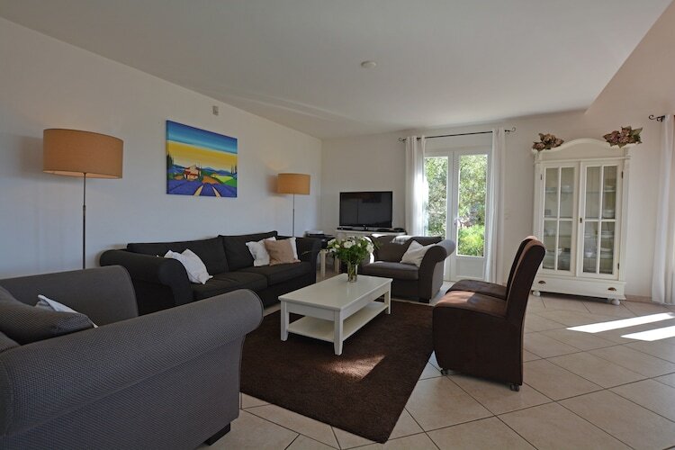 À l'intérieur, l'étage intermédiaire vous accueille avec un spacieux salon doté d'une télévision 3D et d'une table à manger pour huit personnes. La cuisine séparée de style provençal est entièrement équipée d'appareils électroménagers modernes, dont une machine Nespresso, une cafetière Senseo et des plaques à induction. À l'étage, une chambre en mezzanine avec un lit double communique avec une petite pièce ouverte avec deux lits simples, idéale pour les enfants. Cet étage abrite également une bibliothèque/salle de jeux chaleureuse. La villa est entièrement climatisée, sauf au rez-de-chaussée. La piscine est équipée d'une couverture électrique et la terrasse ensoleillée dispose de dix chaises longues. Trois terrasses, dont deux couvertes de grands parasols, offrent un vaste espace de détente extérieur.