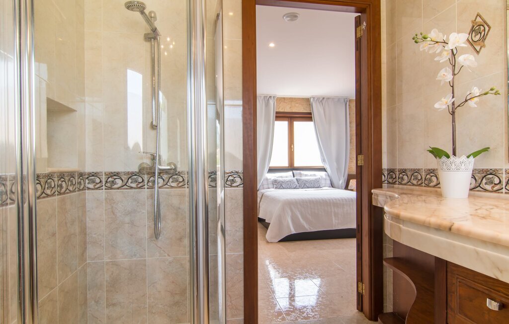 À l'intérieur, la villa offre une atmosphère ouverte et aérée, avec des sols polis et brillants et un mobilier simple et apaisant. Le rez-de-chaussée spacieux réunit une cuisine rustique avec un long plan de travail, un salon/salle à manger et une salle de bains avec douche. À l'étage, la suite parentale est un havre de paix avec un lit double, un dressing et une salle de bain privée en marbre. Deux autres chambres doubles se partagent une salle de bain, l'une d'entre elles dispose d'une kitchenette pour plus d'indépendance. Un cadre vraiment idyllique pour des vacances reposantes.