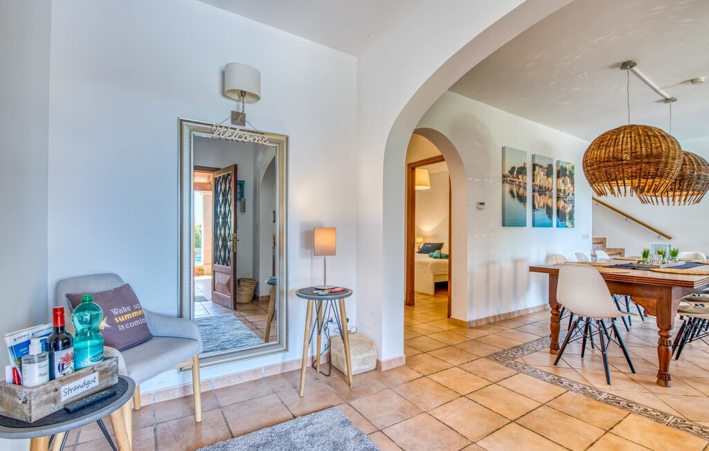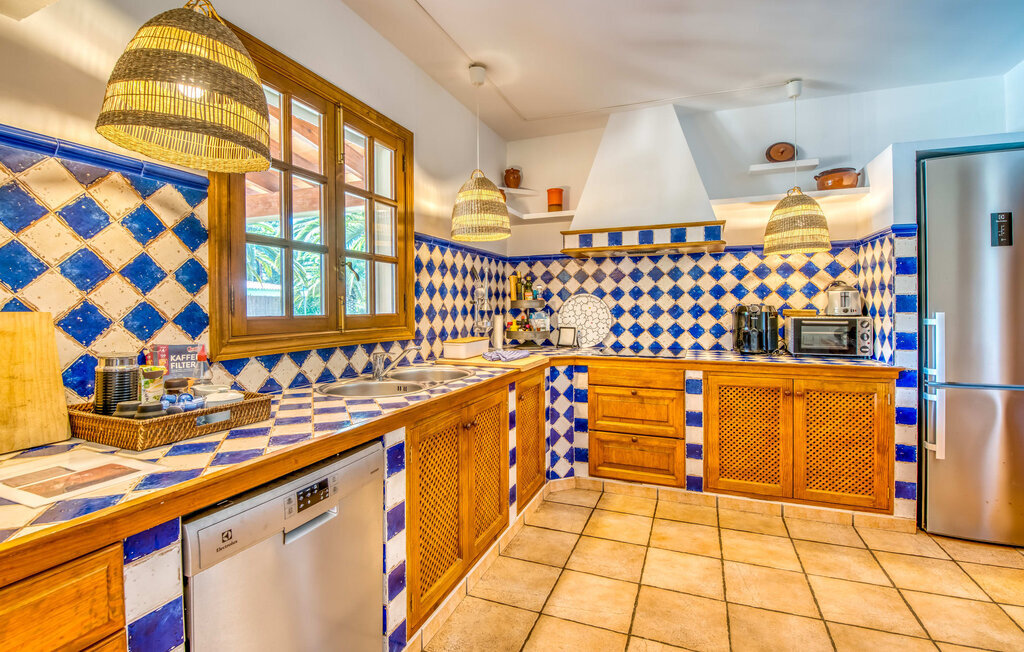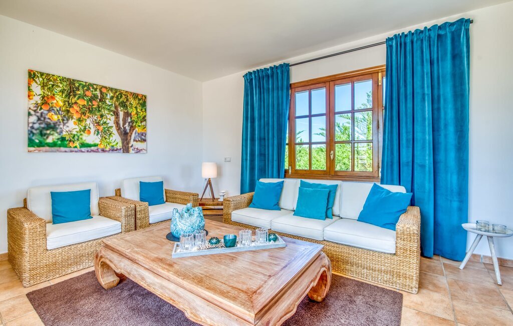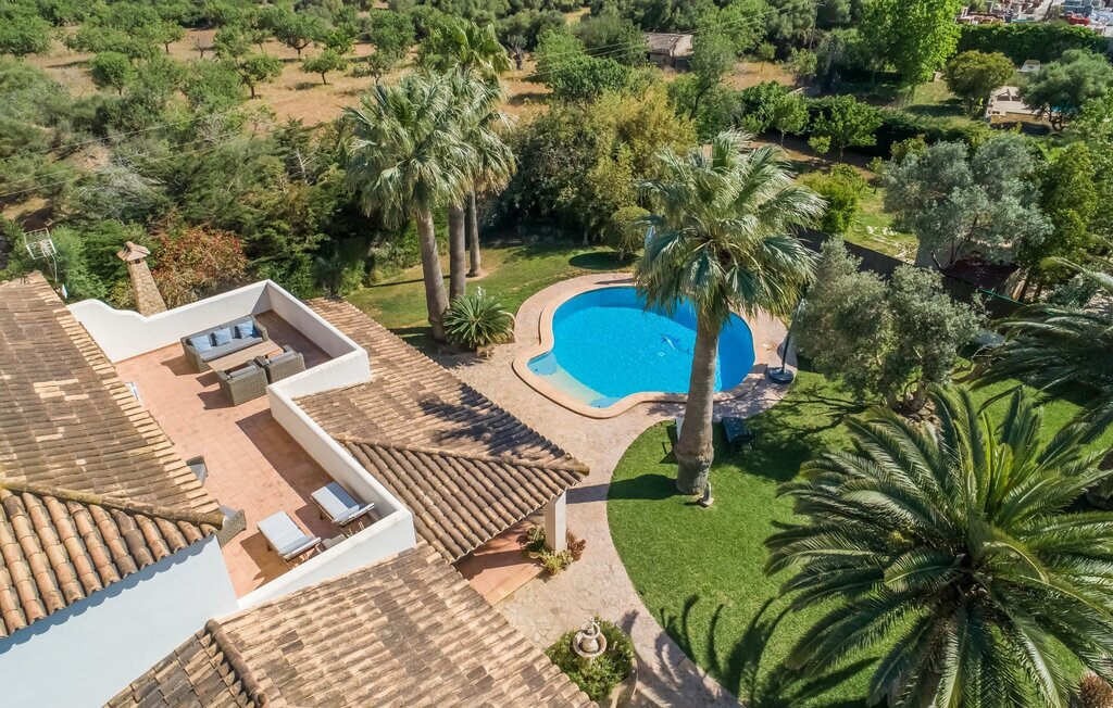 Vivez des vacances parfaites dans une villa magnifiquement aménagée à Majorque, idéalement située à proximité de plages à couper le souffle et d'excellentes commodités locales. La piscine circulaire exceptionnelle, entourée d'une terrasse ensoleillée spacieuse et d'une pelouse luxuriante, invite à la détente et aux bains de soleil. Juste à côté de la piscine, une table en bois massif sous la terrasse couverte peut accueillir confortablement jusqu'à six invités.