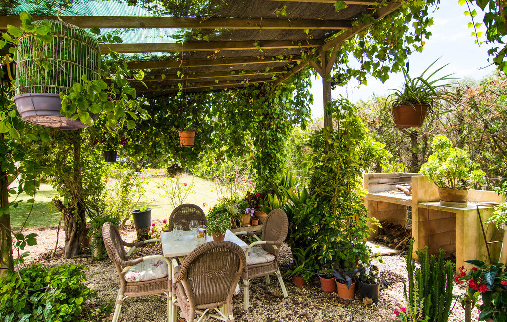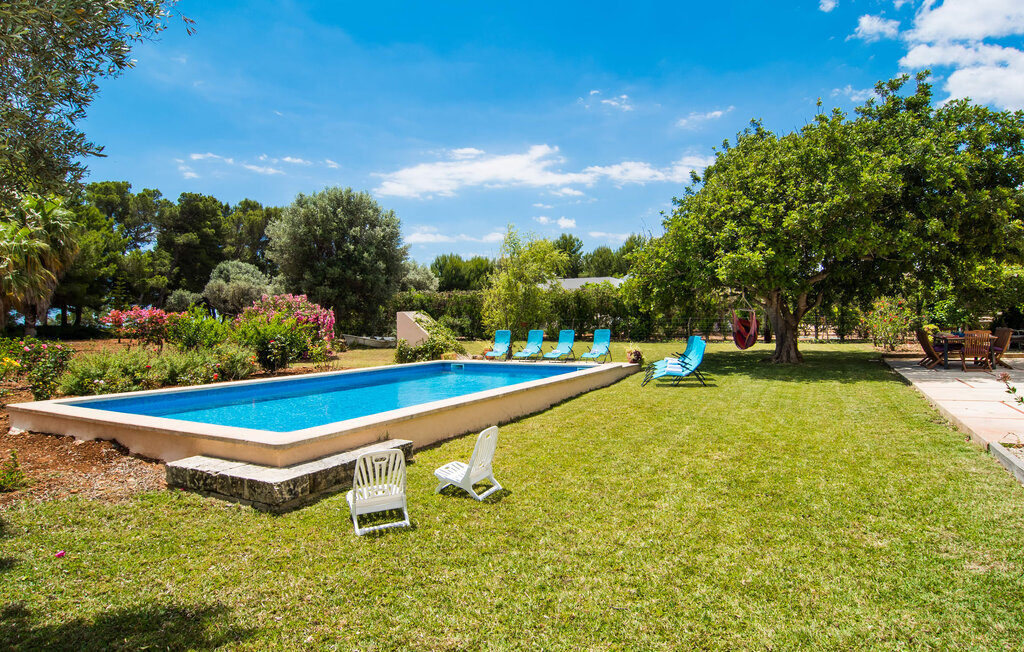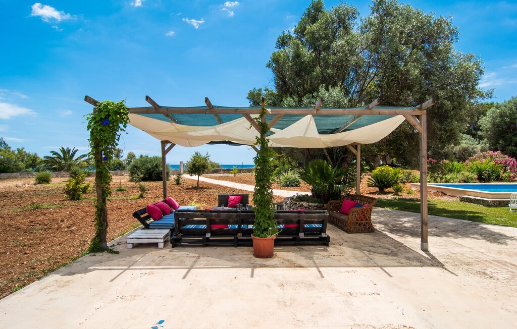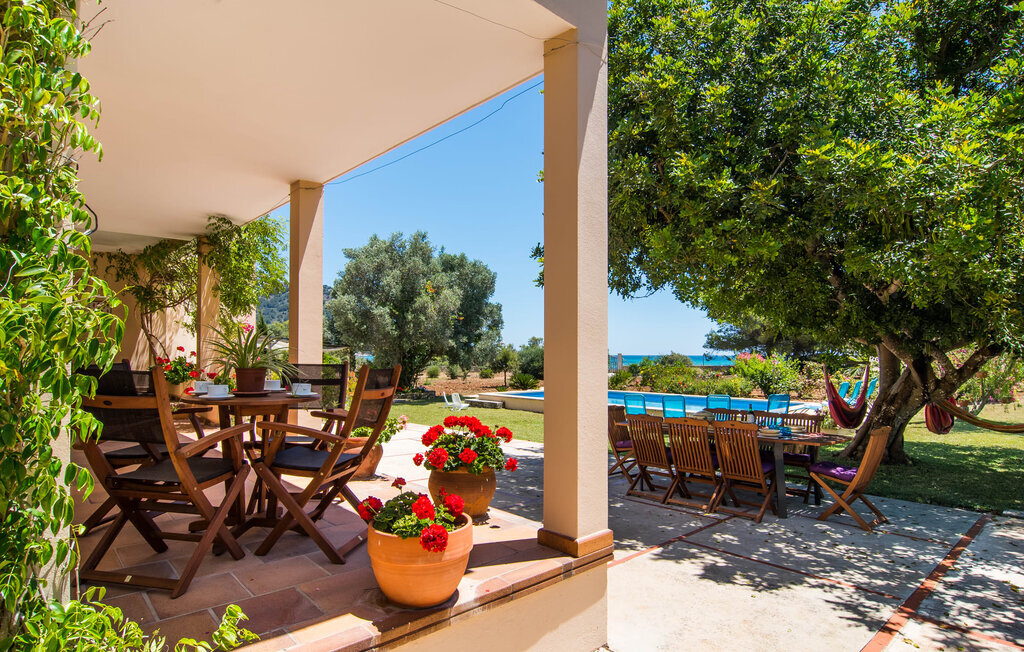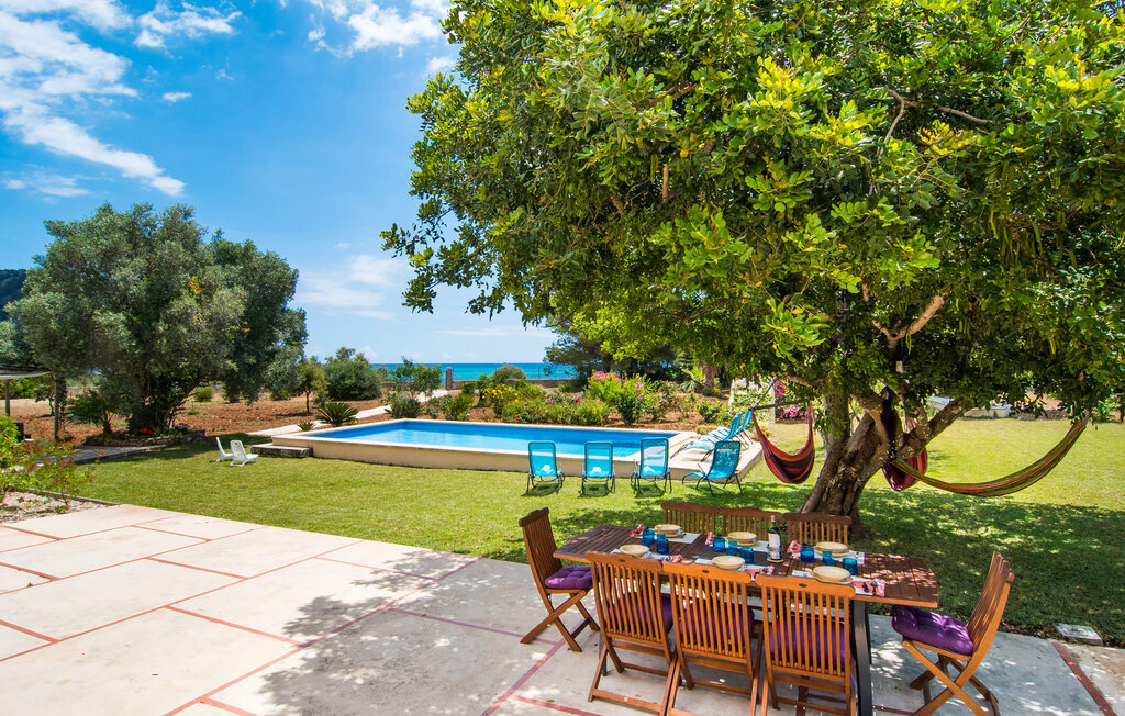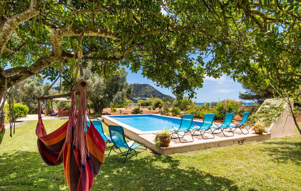 La piscine de jardin ornée de chaises longues turquoises complète l'expérience en plein air, tandis qu'un fauteuil à bascule et un hamac offrent des possibilités de détente supplémentaires. La terrasse spacieuse dispose de nombreuses zones de soleil et d'ombre, idéales pour les repas ou simplement pour profiter de la vue sur la mer. Pour ceux qui souhaitent superviser des activités de barbecue, un pavillon de verdure est à disposition.