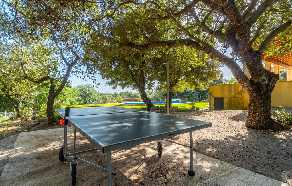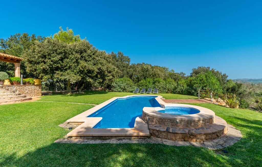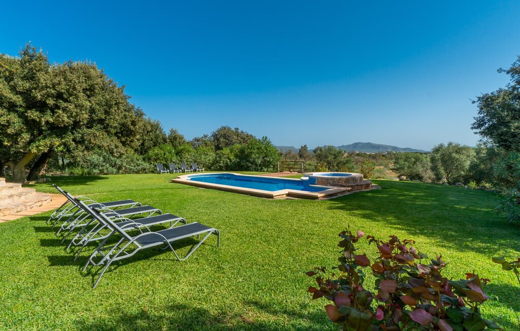 La propriété est entourée d'un magnifique paysage naturel avec des cyprès, des oliviers, des caroubiers et des amandiers ainsi que des jardins fleuris et de vastes pelouses. L'un des points forts de la finca est l'espace piscine unique avec son bassin au carrelage bleu et son magnifique jacuzzi, auquel on accède facilement par un escalier. La longue terrasse couverte à côté de la maison est idéale pour les repas en commun et vous permet de profiter ensemble de la vue.