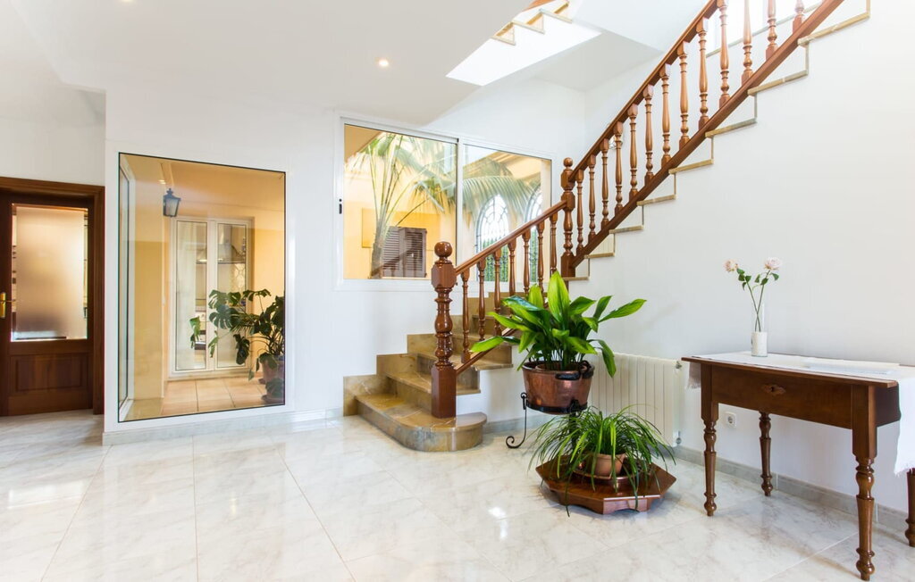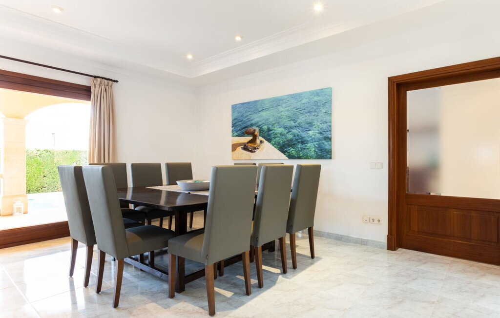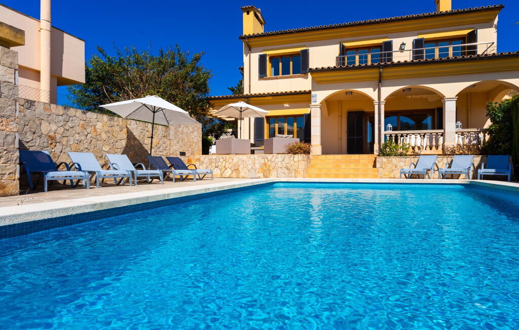 Dans cette luxueuse villa, un séjour inoubliable avec toute la famille vous attend dans un cadre exceptionnel. La propriété a l'apparence de l'architecture typique de Majorque avec des tons jaunes doux. Le grand espace extérieur, avec sa rangée de terrasses et plusieurs coins repas ainsi qu'un barbecue, attire tous les regards. Une haie dense vous offre non seulement une intimité totale, mais met également en valeur la magnifique verdure du jardin. Quelques marches mènent directement au cœur de l'espace extérieur : la grande piscine avec un espace lounge tout autour. Détendez-vous sur l'une des nombreuses chaises longues confortables sous les palmiers majestueux et l'agréable soleil espagnol. Les jours de grande chaleur, des parasols offrent une ombre rafraîchissante. La piscine est éclairée la nuit, ce qui vous permet de profiter d'un bain rafraîchissant même à des heures tardives.