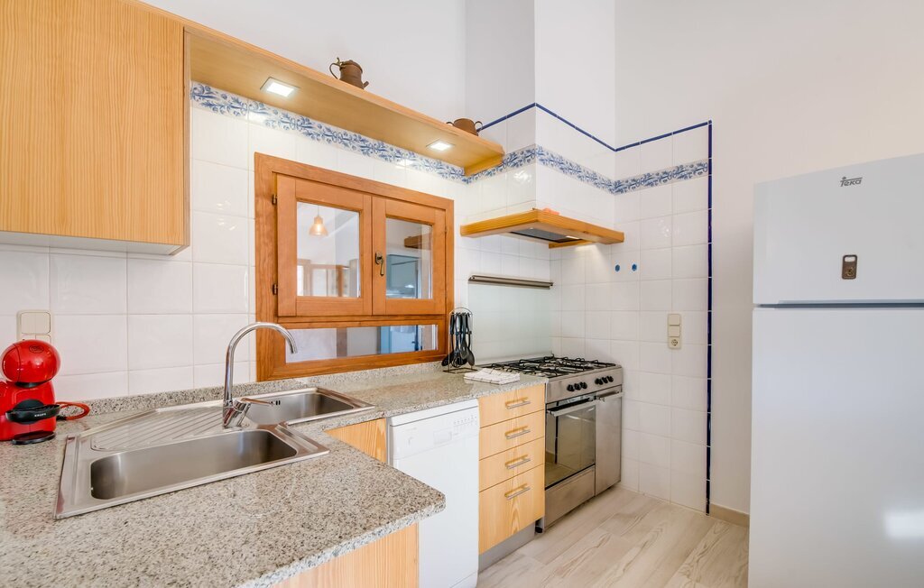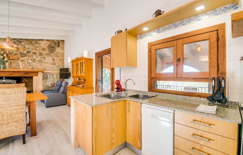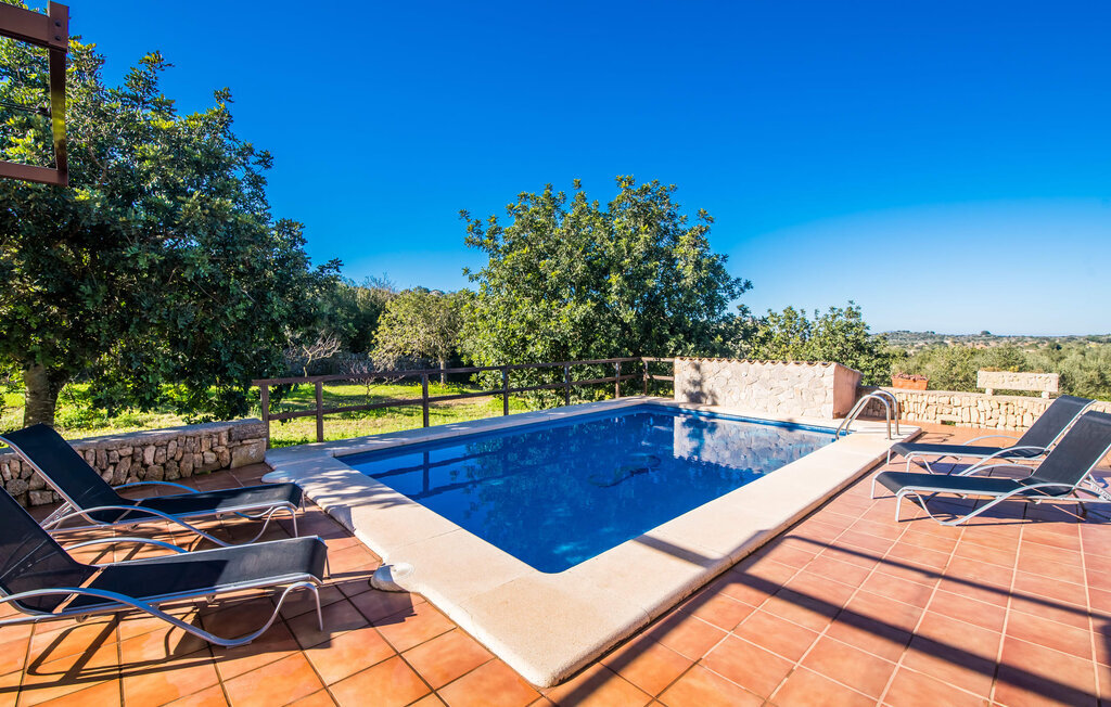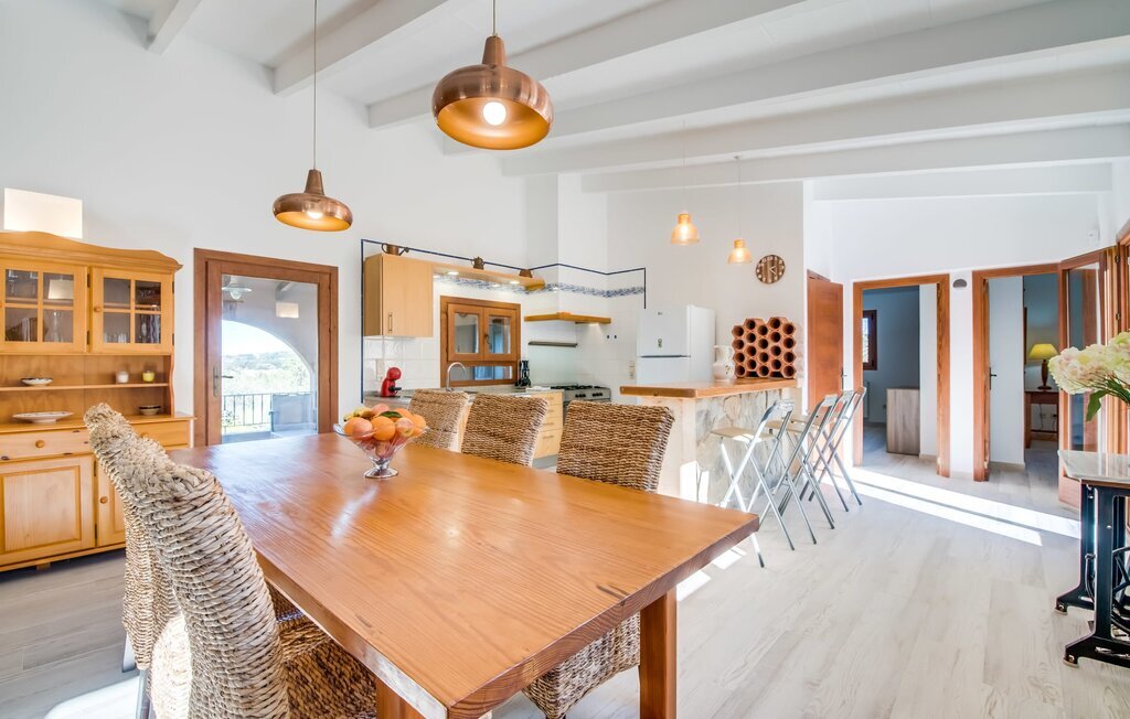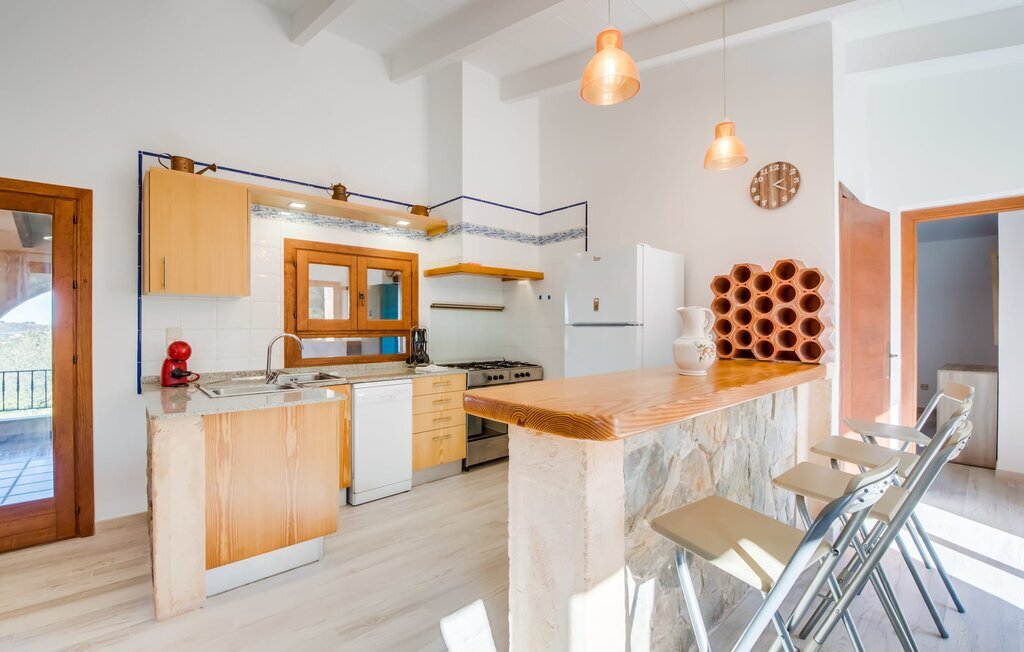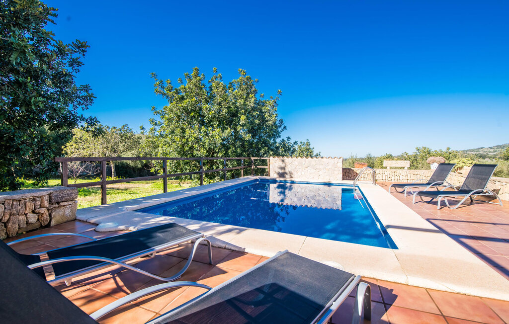 La villa Cavall de Mar jouit d'une situation magnifique et calme au pied de la Muntanya de Calicant, une partie de la réserve naturelle de la Serra de Llevant. Des amandiers, des caroubiers et des figuiers poussent dans le paysage. Les troupeaux de moutons font également partie du paysage et parfois, on entend au loin les petites cloches. Ici, il n'y a pas de voisins directs. La villa est située le long d'une route à une voie à peine fréquentée. L'avant est entouré d'une clôture, tandis que l'arrière offre un paysage ouvert, de sorte que l'on peut immédiatement profiter du panorama. Le nom de la villa vient de l'hippocampe (Cavall de Mar) qui est représenté en mosaïque sur le fond de la piscine. Sur le côté sud de la villa se trouve une cour intérieure spacieuse, idéale pour jouer. Une échelle permet d'accéder à la belle piscine. Le système de nettoyage moderne évite l'utilisation de chlore dans l'eau de la piscine, ce qui la rend naturellement plus hygiénique et plus sûre. Une douche extérieure est disponible sur le mur de la maison. Vous pouvez aussi la rincer rapidement une fois que vous sentez la chaleur. Des chaises longues confortables vous invitent à vous détendre longuement et à prendre des bains de soleil. Des chaises confortables et une table à manger vous invitent sur une magnifique et vaste terrasse où vous pourrez vous détendre et profiter de la vue imprenable sur le paysage. C'est dans ce lieu que vous pourrez accueillir la journée dans une atmosphère feutrée et terminer la soirée en dégustant des boissons courantes avec une touche de poésie. Dans ce lieu, les barbecues conviviaux avec de délicieuses spécialités régionales sont incontournables. Au gré de vos envies, vous y trouverez également une cuisine extérieure originale, puisqu'un fantastique barbecue au charbon de bois y est installé.