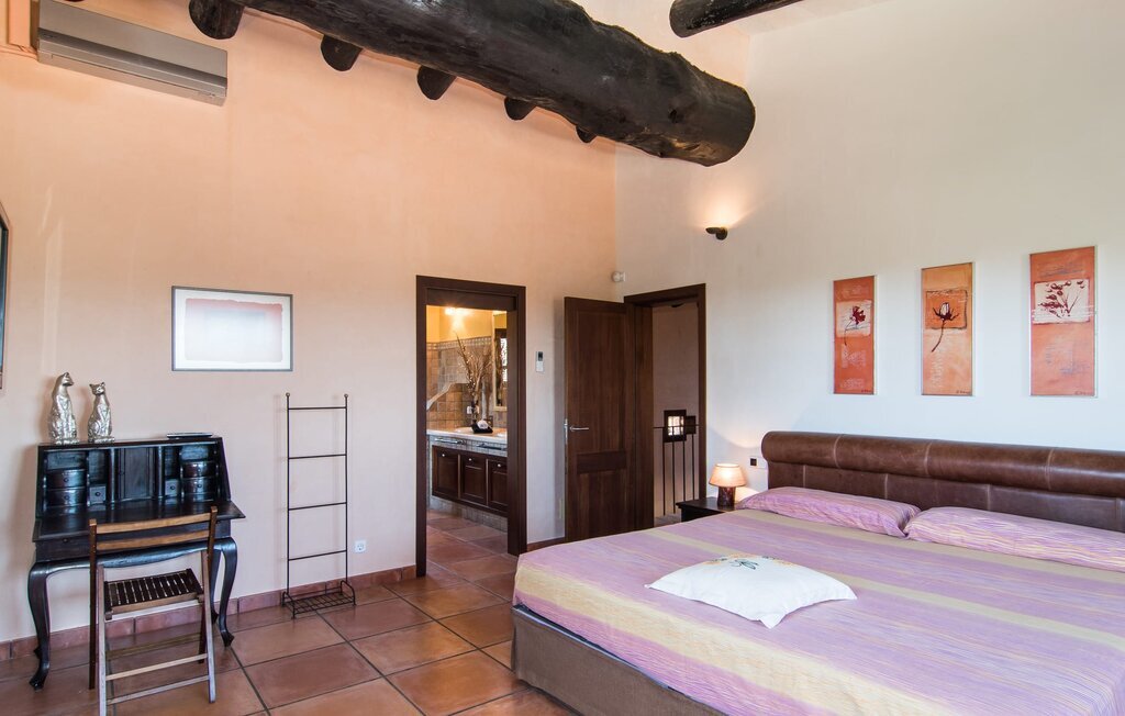 Dès l'entrée dans le bâtiment, l'équipement de qualité se remarque au premier coup d'œil. Dans le salon se trouvent deux canapés extrêmement confortables et une télévision par satellite. Les soirs plus frais, vous pouvez même vous détendre à la lumière de la cheminée et à la chaleur d'un feu. Le mur en pierre naturelle rustique à l'avant de ce salon souligne habilement l'atmosphère haut de gamme. Les décorations choisies et les poutres rondes du plafond y contribuent également. La cuisine spacieuse et très moderne est équipée d'une table ronde, d'un réfrigérateur-congélateur en acier inoxydable, d'une unité d'îlot pratique et d'un lave-vaisselle. Il y a également un petit comptoir sur lequel on peut s'asseoir. Les chambres à coucher climatisées sont spacieuses, équipées de meubles de qualité et présentent un design très élégant. L'absence de désordre gênant confère à ces pièces une ambiance lumineuse et élégante. Le design haut de gamme des chambres à coucher est également pleinement mis en valeur dans les salles de bains. Celles-ci se distinguent par un style très individuel, généreux et en tout cas toujours original, parfois coloré.