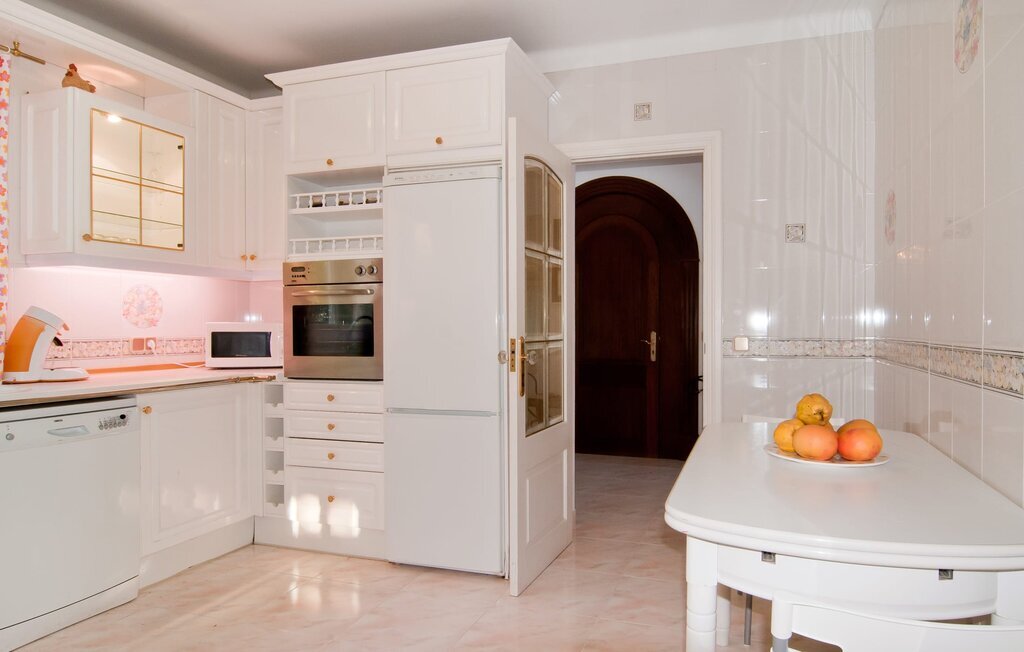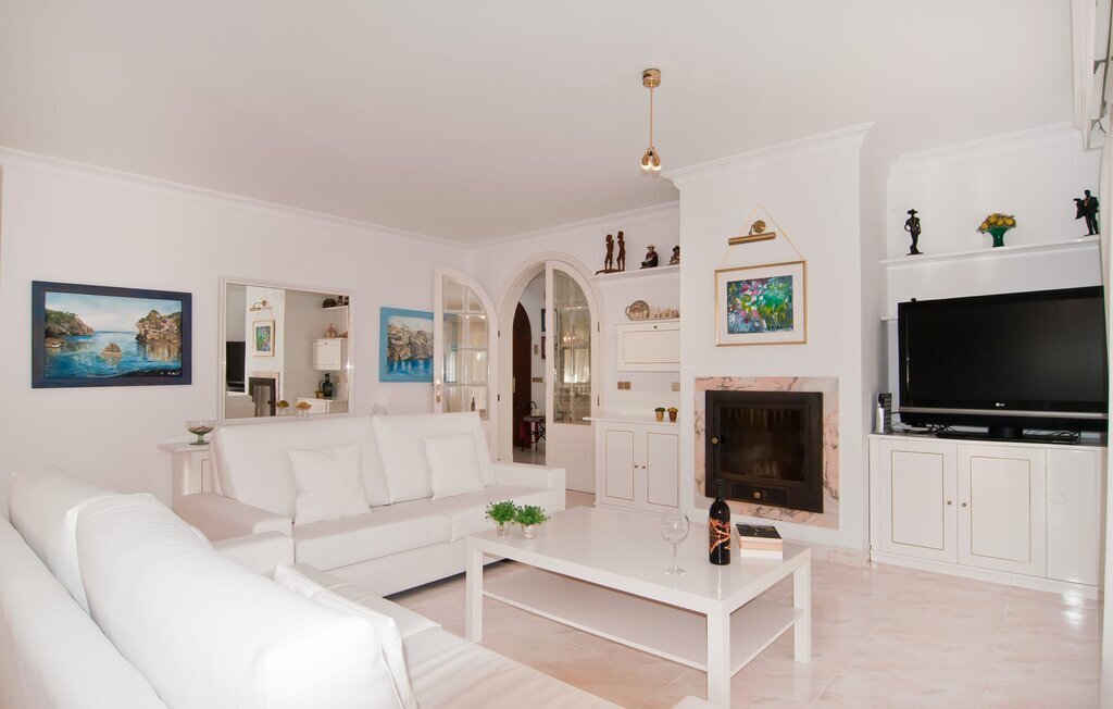 La maison très bien entretenue séduit par son ambiance remarquablement claire, caractérisée par des murs et des meubles blancs, habilement accentués par des touches de couleur bien dosées. La décoration a également été réalisée avec parcimonie et goût. Il en résulte une atmosphère claire et élégante qui vous invite de manière convaincante à profiter du temps passé dans la villa. Dans l'entrée chic, vous trouverez la cage d'escalier et l'accès à la cuisine, tandis qu'au rez-de-chaussée se trouve également une chambre à coucher avec salle de bain. La douche et la baignoire étaient à l'origine intégrées dans la pièce et ne sont plus séparées que par une paroi en verre. Un grand salon/salle à manger complète cet étage. Lors des soirées fraîches, la cheminée apporte un confort supplémentaire. Vous pouvez prendre vos repas à l'intérieur à l'une des deux tables à manger. La cuisine, également blanche, est spacieuse et entièrement équipée avec tout ce dont vous avez besoin pour vos besoins quotidiens en cuisine, y compris une bouilloire, un filtre et une machine à expresso. À l'étage supérieur se trouvent une autre chambre à coucher et deux salles de bains, chacune partagée par deux chambres à coucher. Un fer à repasser et un sèche-cheveux sont disponibles, vous n'avez donc pas besoin d'en apporter un de chez vous.