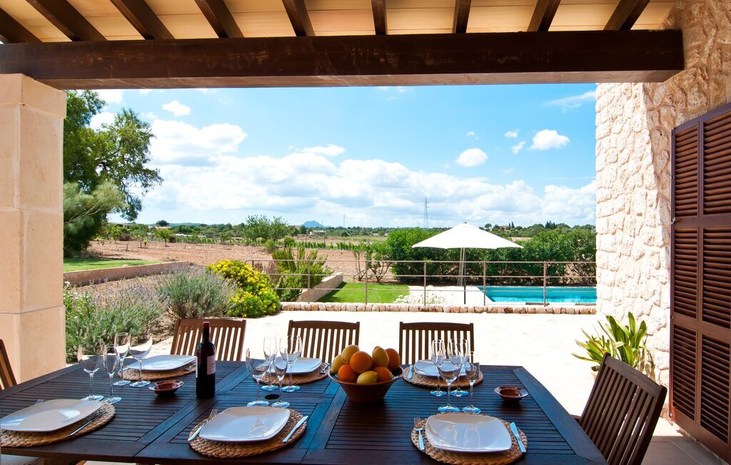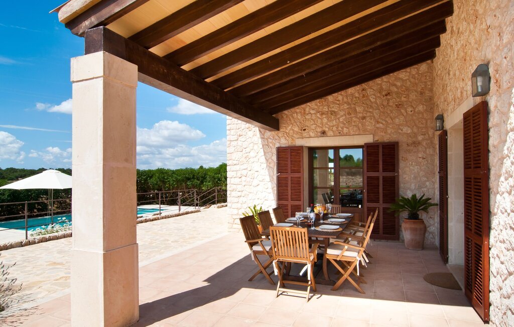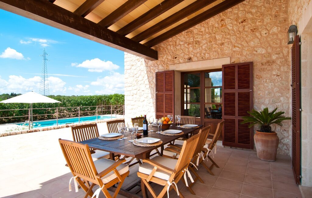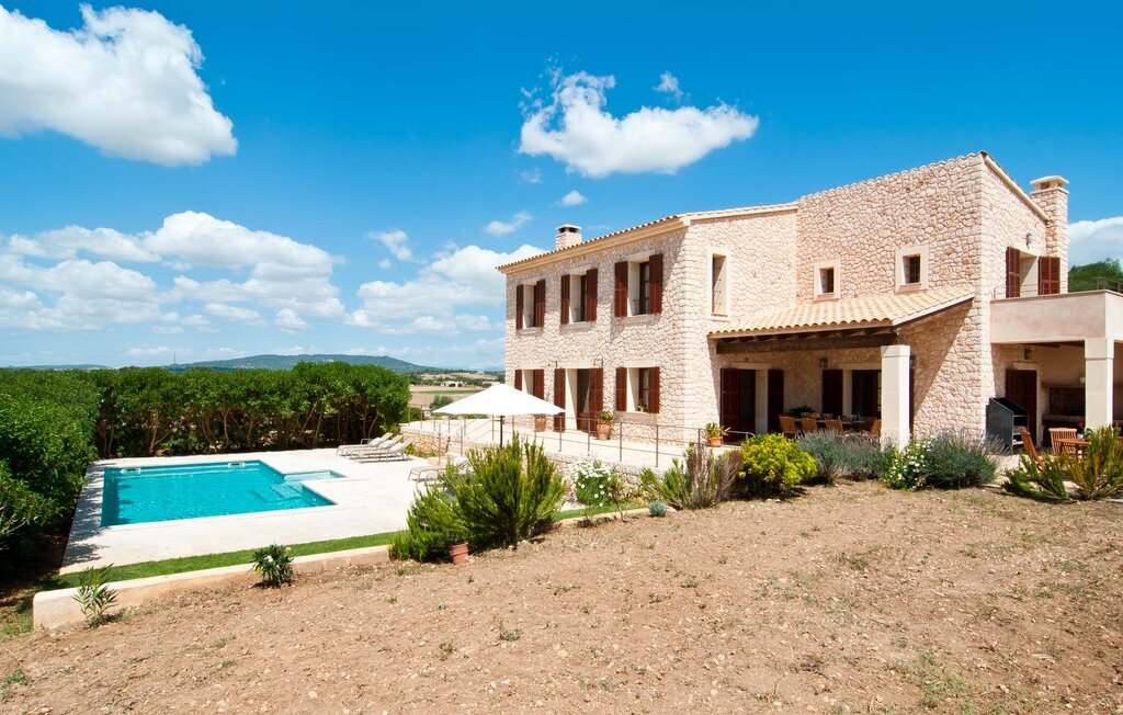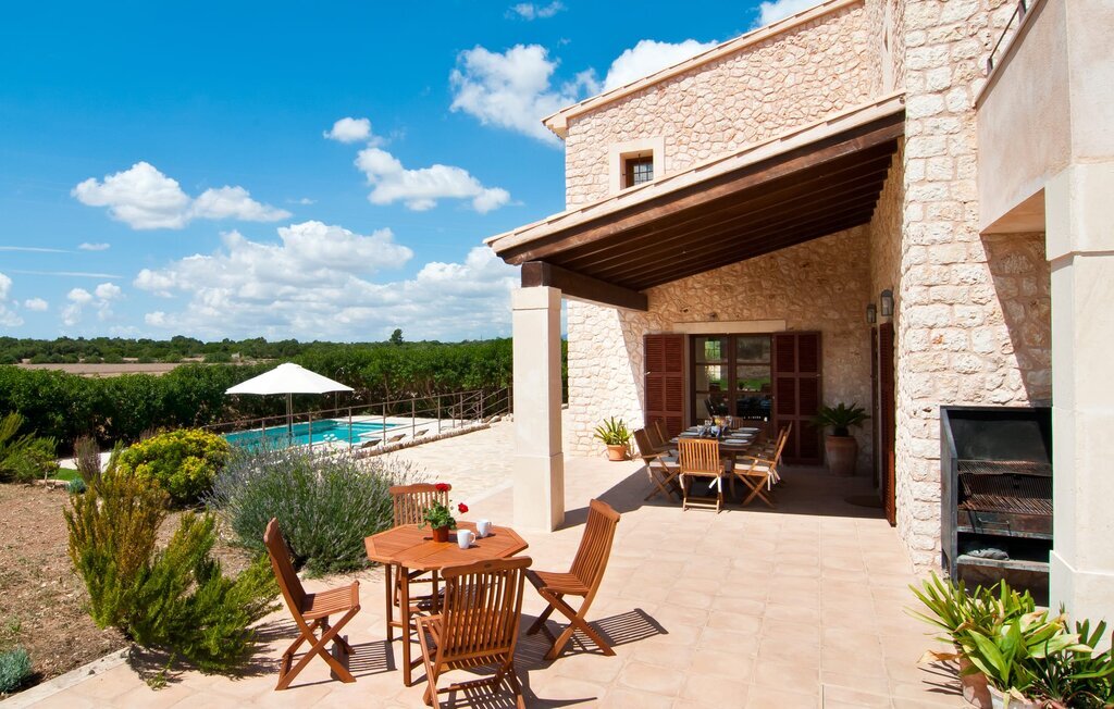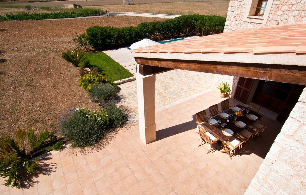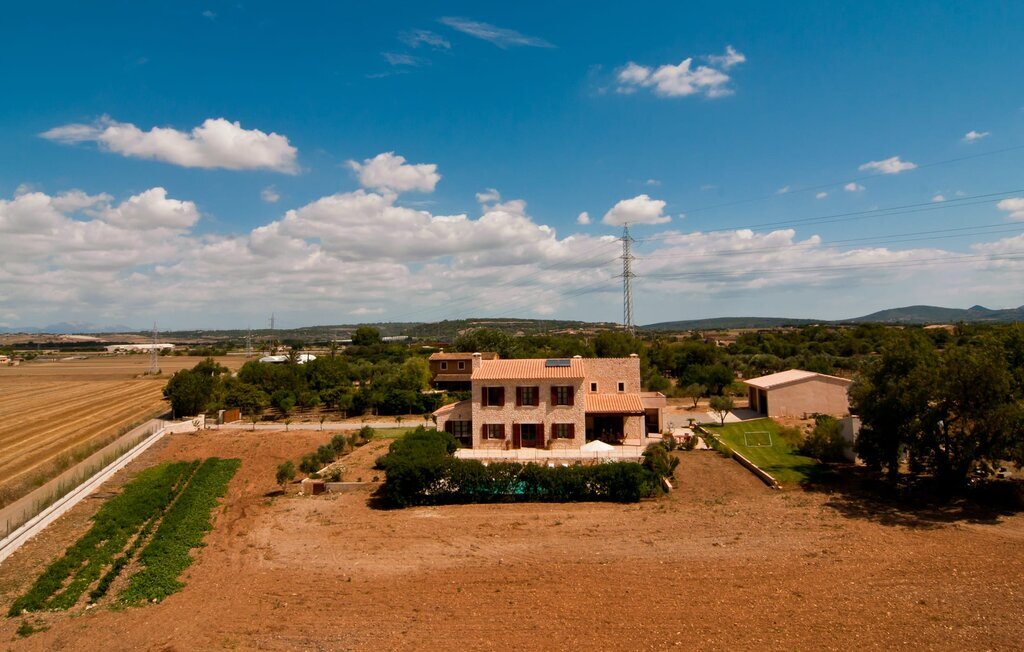La Villa Son Perot est un lieu de villégiature enchanteur que l'on reconnaît déjà de loin. La maison de deux étages, avec une façade en pierre naturelle d'une beauté à couper le souffle et des fenêtres et volets en bois, se trouve sur un terrain de 15.000 m² qui bénéficie d'un bon accès entre Manacor et Vilafranca, tout en étant situé à la campagne de Bonany. La propriété offre également tout ce dont vous avez besoin pour des vacances bien remplies. Une partie du terrain magnifiquement entouré est caractérisée par des terrasses et des pelouses ainsi que par diverses plantations méditerranéennes décoratives dans des parterres et des bacs. La piscine de 9 mètres de long, située devant la maison, vous permettra de vous rafraîchir les jours de grande chaleur. Le bassin est très facilement accessible par un large escalier et est bordé d'une terrasse ensoleillée accueillante. Six chaises longues confortables sont à votre disposition pour vous détendre longuement. Vous pouvez vous allonger et rêver sous le ciel bleu profond de la Méditerranée, en laissant le quotidien loin derrière vous. Pour une protection supplémentaire contre les rayons UV, un parasol est à disposition. La terrasse devant la maison, accessible par quelques marches, offre également des possibilités de rester à l'ombre et de profiter de l'environnement de rêve. Vous pouvez vous asseoir à la table à manger massive dans une superbe atmosphère, prendre vos repas à l'extérieur à votre guise et laisser votre regard se perdre dans le lointain. La cuisine extérieure et le barbecue offrent d'excellentes possibilités de préparer des repas en plein air et permettent de concocter des délices régionaux avec les produits récoltés au marché.