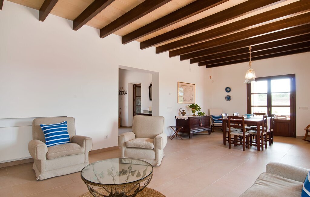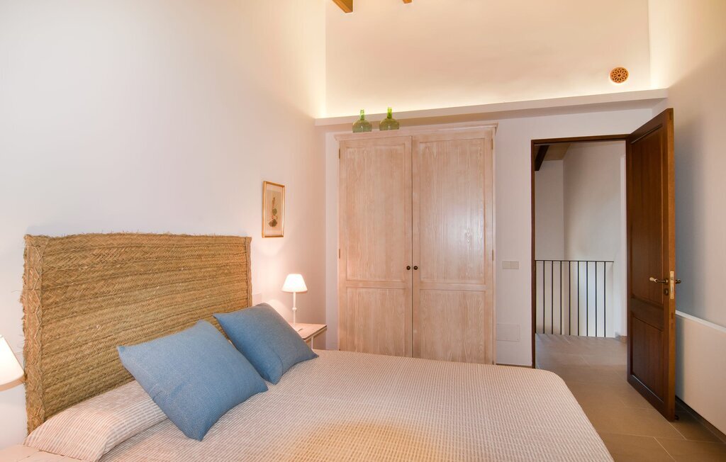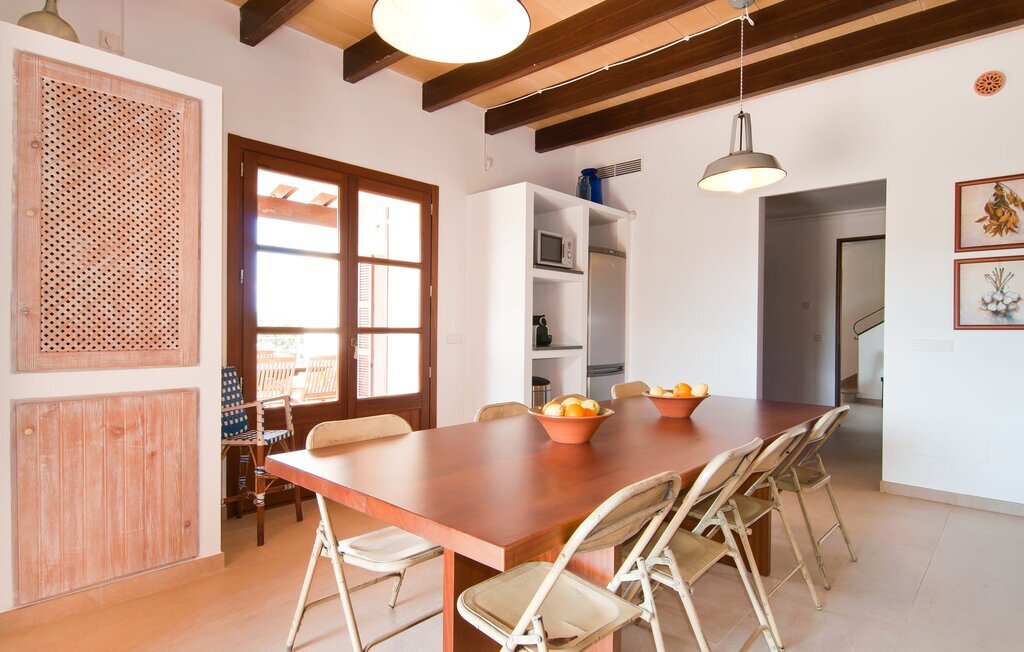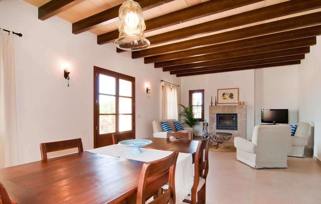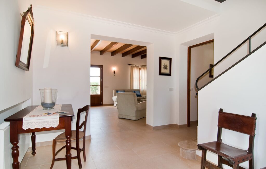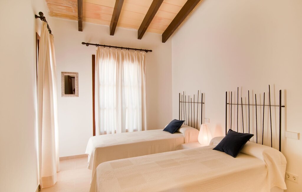 L'intérieur de la maison est non seulement confortable, mais aussi de très bon goût, créant une atmosphère fantastique où il fait bon s'attarder. Des matériaux clairs sont entourés d'éléments contrastés, en grande partie en bois, qui contribuent de manière décisive à l'ambiance harmonieuse. Vous pouvez vous installer confortablement dans le coin canapé ou prendre vos repas ensemble dans le salon/salle à manger ouvert et relaxant. Une télévision et une cheminée complètent le confort de cette chambre. Dans cette maison, la décoration est utilisée avec parcimonie et avec discernement, de sorte qu'il n'y a à aucun moment une image surchargée, mais au contraire, le sentiment de générosité marque agréablement les pièces. Cela vaut également pour la cuisine spacieuse, dans laquelle le flair typiquement majorquin a été habilement combiné avec la modernité. Un endroit formidable pour une fête en famille ou entre amis. La cuisine offre tout ce dont vous avez besoin au quotidien. La machine à café filtre vous permet de préparer du café frais chaque matin. Quatre chambres à coucher ont été aménagées individuellement et offrent à chacun le lieu de repos idéal. Au total, l'objet est équipé de six lits, dont quatre mesurent 0,90x2,00m et deux 1,60x2,00m. Une autre chambre à coucher est très joliment aménagée en chambre d'enfant et dispose d'un lit simple et d'un lit superposé avec un troisième lit gigogne. Les dimensions du matelas sont ici de 0,80x1,80m. Cette maison de vacances peut donc accueillir au maximum huit adultes et quatre enfants. Les trois salles de bains élégantes, l'une au rez-de-chaussée et les deux autres au premier étage, sont équipées d'un équipement sophistiqué et s'inscrivent de manière convaincante dans l'esthétique de la maison. Deux sèche-cheveux ainsi qu'un fer à repasser sont disponibles dans la maison et ne doivent pas être apportés de la maison.