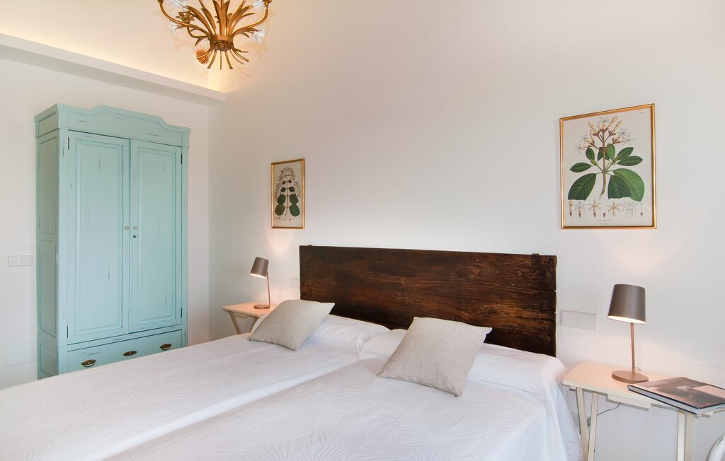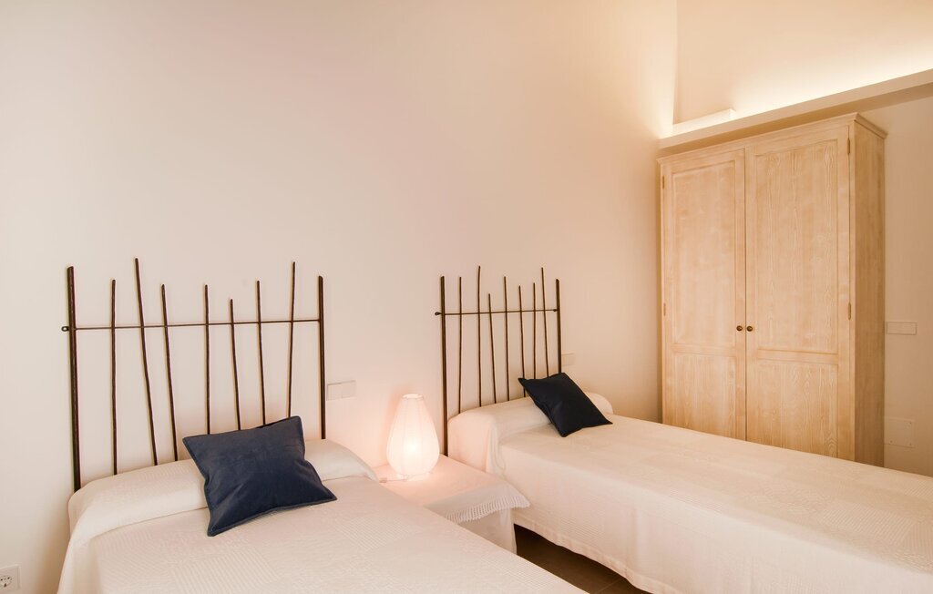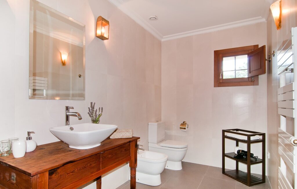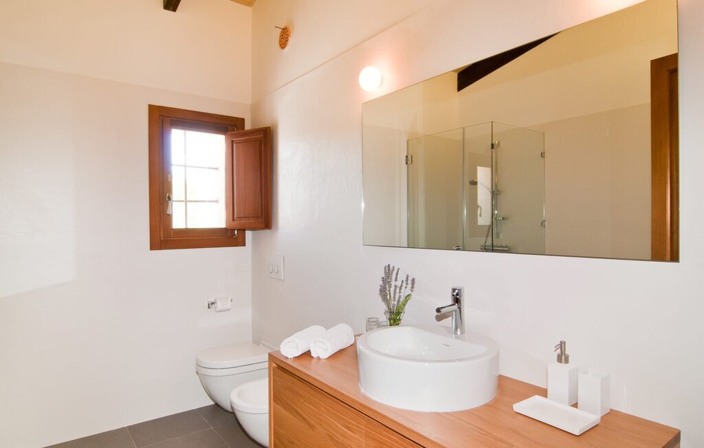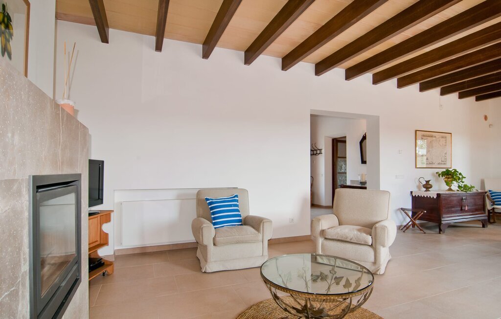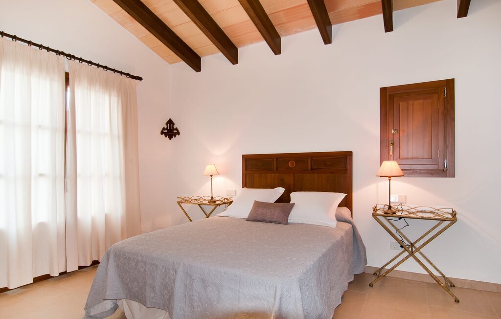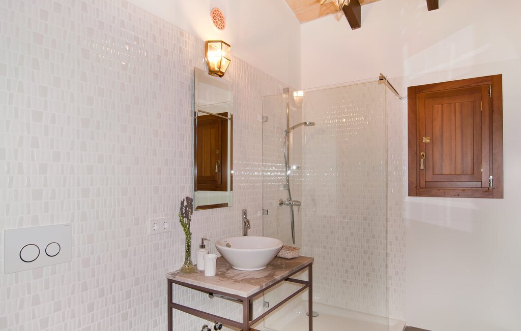 L'intérieur de la maison est non seulement confortable, mais aussi de très bon goût, créant une atmosphère fantastique où il fait bon s'attarder. Des matériaux clairs sont entourés d'éléments contrastés, en grande partie en bois, qui contribuent de manière décisive à l'ambiance harmonieuse. Vous pouvez vous installer confortablement dans le coin canapé ou prendre vos repas ensemble dans le salon/salle à manger ouvert et relaxant. Une télévision et une cheminée complètent le confort de cette chambre. Dans cette maison, la décoration est utilisée avec parcimonie et avec discernement, de sorte qu'il n'y a à aucun moment une image surchargée, mais au contraire, le sentiment de générosité marque agréablement les pièces. Cela vaut également pour la cuisine spacieuse, dans laquelle le flair typiquement majorquin a été habilement combiné avec la modernité. Un endroit formidable pour une fête en famille ou entre amis. La cuisine offre tout ce dont vous avez besoin au quotidien. La machine à café filtre vous permet de préparer du café frais chaque matin. Quatre chambres à coucher ont été aménagées individuellement et offrent à chacun le lieu de repos idéal. Au total, l'objet est équipé de six lits, dont quatre mesurent 0,90x2,00m et deux 1,60x2,00m. Une autre chambre à coucher est très joliment aménagée en chambre d'enfant et dispose d'un lit simple et d'un lit superposé avec un troisième lit gigogne. Les dimensions du matelas sont ici de 0,80x1,80m. Cette maison de vacances peut donc accueillir au maximum huit adultes et quatre enfants. Les trois salles de bains élégantes, l'une au rez-de-chaussée et les deux autres au premier étage, sont équipées d'un équipement sophistiqué et s'inscrivent de manière convaincante dans l'esthétique de la maison. Deux sèche-cheveux ainsi qu'un fer à repasser sont disponibles dans la maison et ne doivent pas être apportés de la maison.