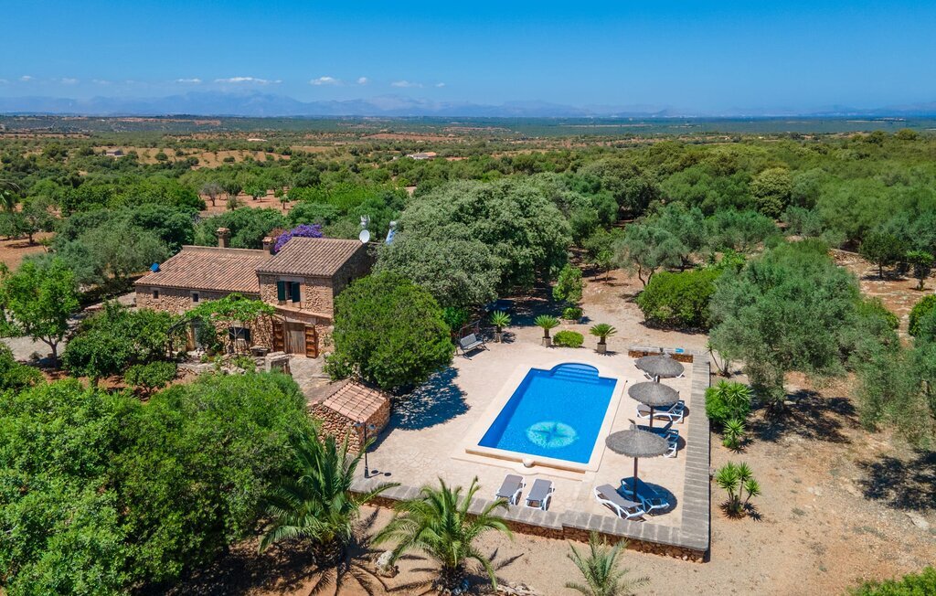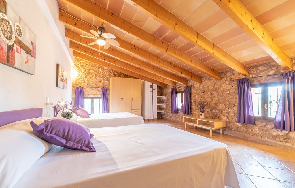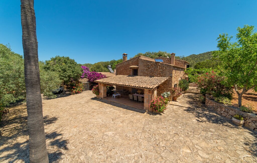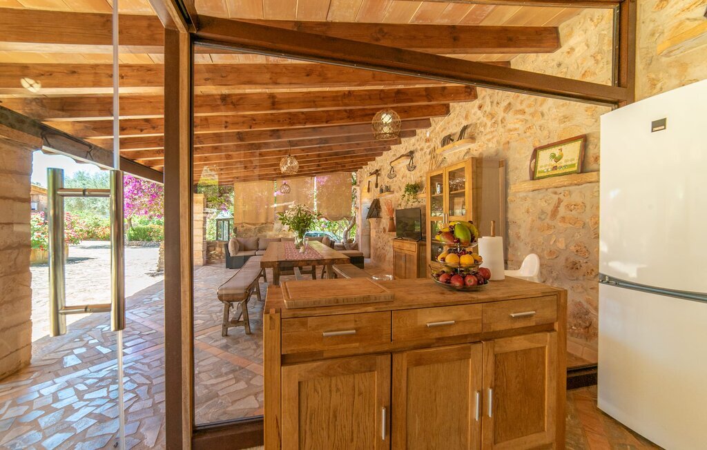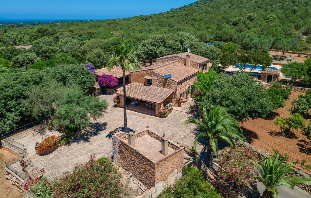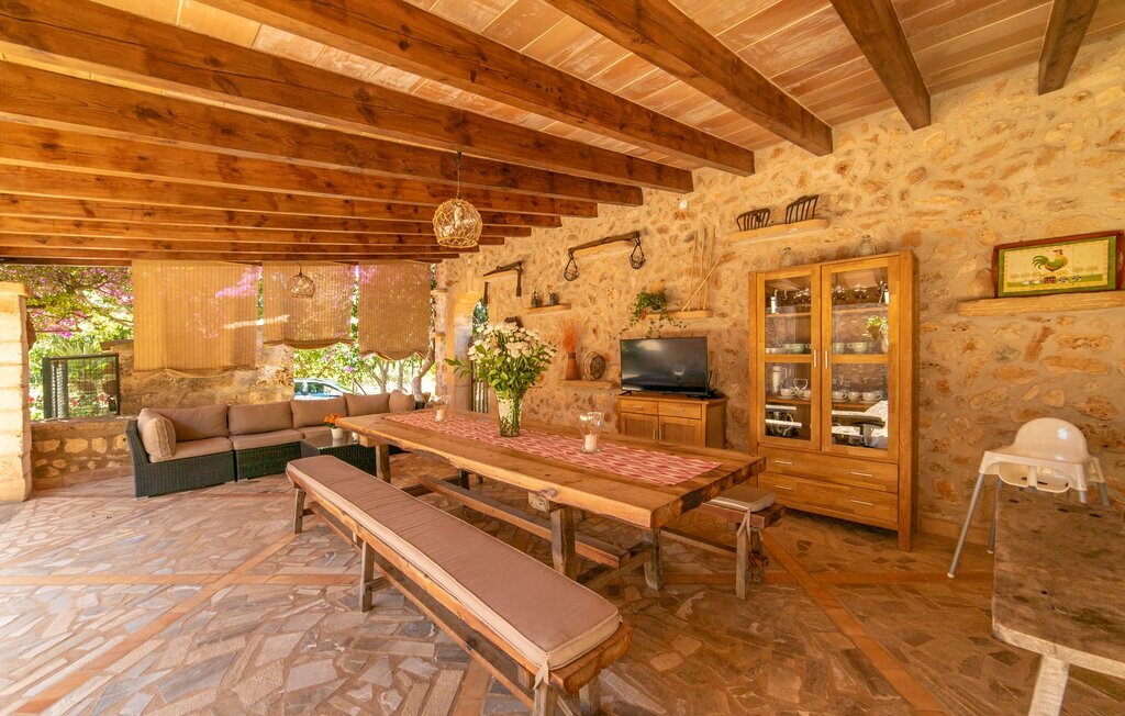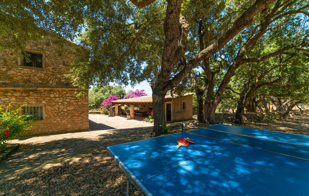 Bienvenue au domaine de Can Comes, qui est le reflet de l'authentique Majorque si souvent citée. La maçonnerie du vénérable bâtiment trahit l'ancienne utilisation agricole de la villa, qui a été transformée avec amour en une maison de campagne moderne par son sympathique propriétaire. Cependant, la tradition enchanteresse du passé transparaît toujours dans l'aménagement de la propriété et l'équipement en souvenirs anciens de la maison. La taille du terrain est à elle seule époustouflante : 140.000 m² de terrain pour les visiteurs, cela signifie une tranquillité absolue et le luxe de pouvoir passer ses vacances avec des amis ou en famille sans devoir tenir compte des voisins. Des oliviers majestueux et divers arbres fruitiers, dont l'ombre offre de belles places assises, entourent la maison et son vaste terrain, sur lequel se trouvent, outre une aire de jeux pour enfants, un terrain de volley-ball. En outre, des moutons, des chèvres, des poules, des tortues et un cheval, toujours bien encadrés par le propriétaire, créent une atmosphère rurale merveilleuse. À côté de la maison se trouve une zone de piscine magnifiquement aménagée, composée d'une grande piscine avec des incrustations élaborées et d'une terrasse ensoleillée avec des parasols en bambou fixes, qui donnent une impression de Caraïbes lorsque l'on fait la sieste sur les chaises longues ergonomiques. Il y a deux terrasses couvertes au total. L'une d'entre elles se trouve juste à côté de la maison et est équipée de meubles en osier attrayants et de tables vintage. Vous pourrez y passer un après-midi à jouer entre les bougainvilliers odorants. Le point fort absolu pour les fans d'extérieur est sans doute la cuisine d'extérieur de haute qualité, récemment aménagée et disposant même d'une télévision. Vous pourrez vous y asseoir dans la fraîcheur du salon ou autour de la longue table à manger et savourer les plats préparés sur le barbecue maçonné. Cette superbe cuisine d'été sera probablement le centre d'intérêt de tous les voyageurs, où l'on pourra se retrouver à toute heure de la journée, manger ensemble, discuter et déguster un verre de vin ou une bière fraîche en toute décontraction.