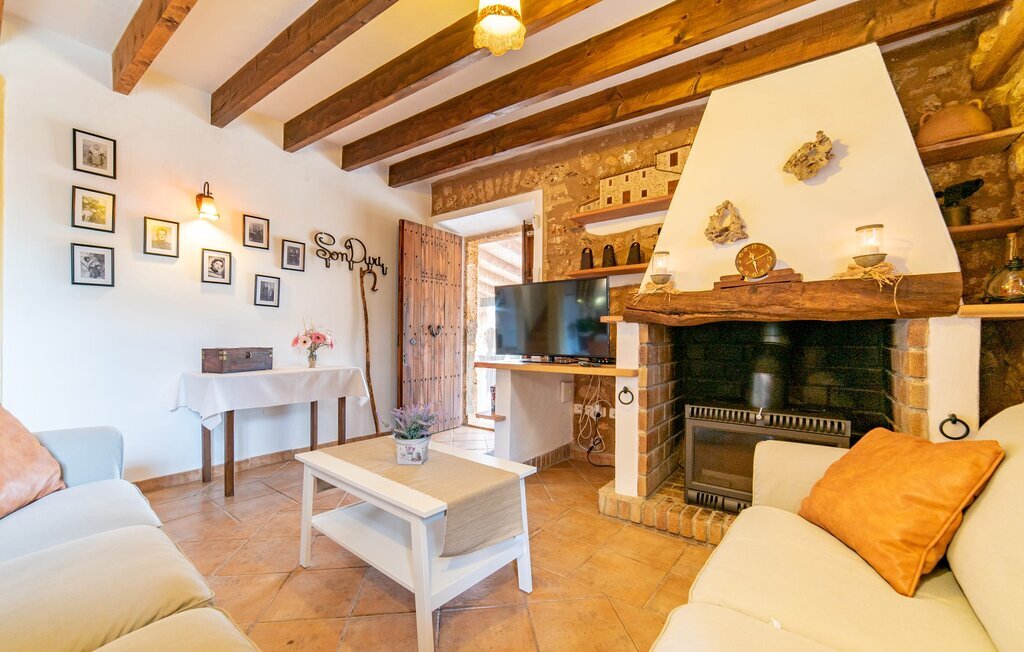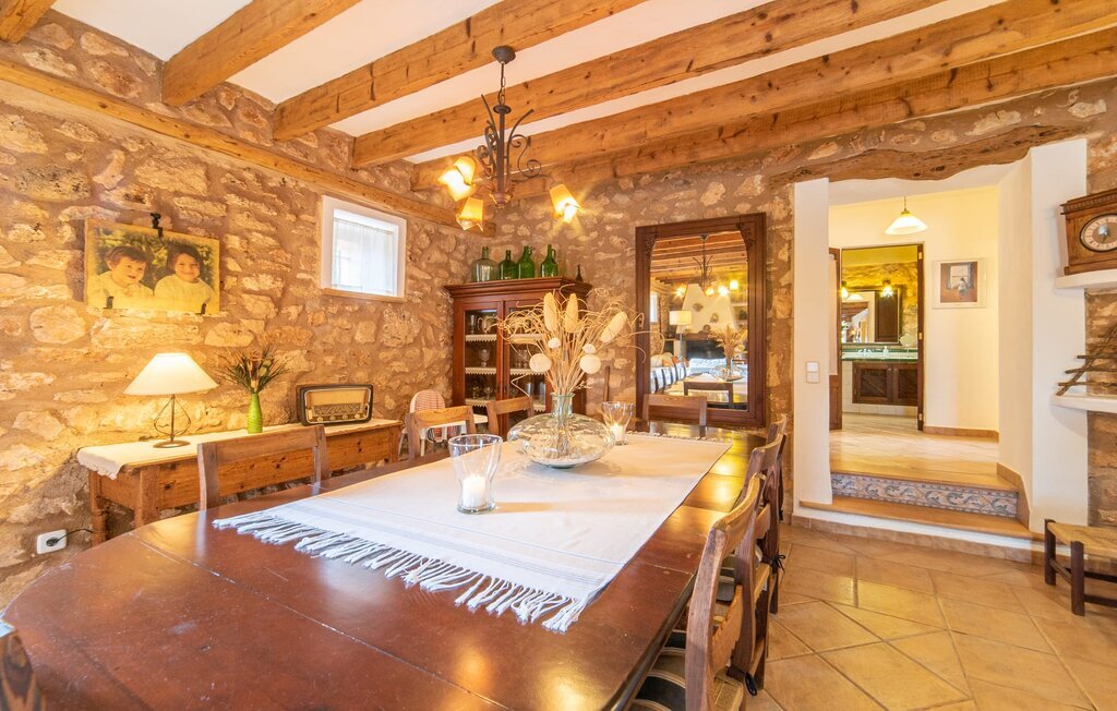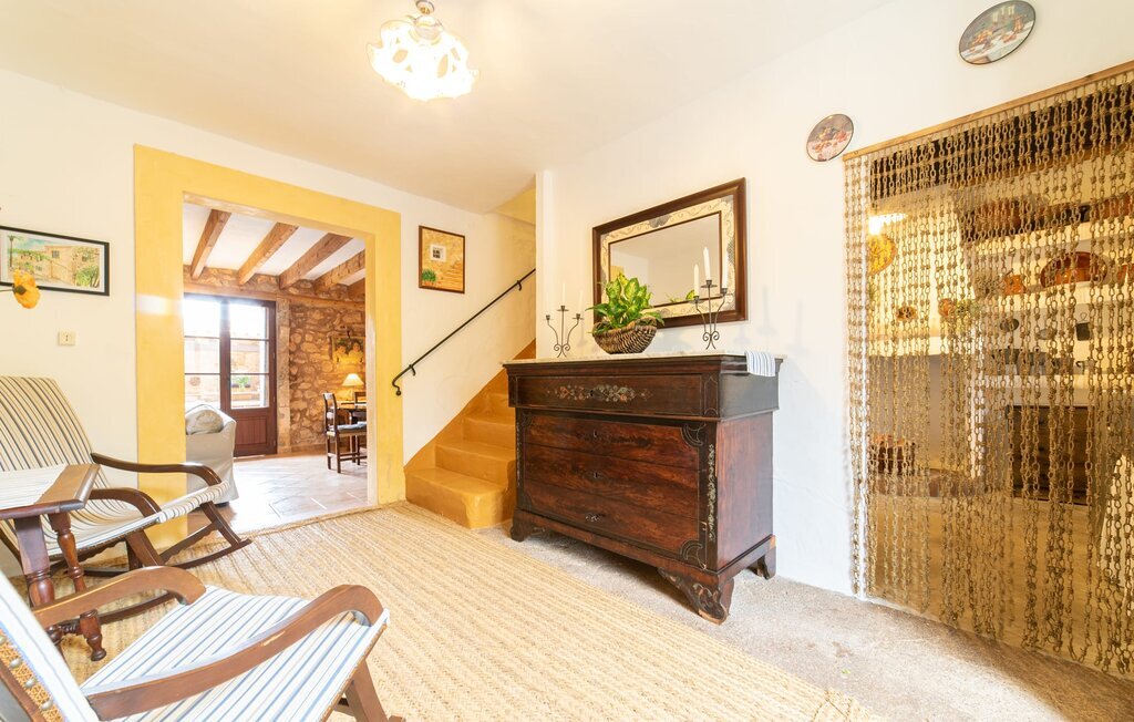 L'extérieur stylé de la maison laisse déjà deviner ce qui vous attend à l'intérieur de cette ferme majorquine : beaucoup d'atmosphère avec des pierres de taille apparentes, de vieilles poutres en bois, quelques meubles et objets de décoration anciens complétés par de nouveaux. Un salon avec une salle à manger attenante crée une atmosphère très confortable, que vous pouvez apprécier dans le coin canapé lumineux devant la cheminée. La cuisine rustique se présente également avec goût et a conservé son cachet authentique avec un évier en céramique d'origine, une ancienne cheminée ouverte et des carreaux peints à la main. Malgré son caractère rustique, on y trouve aussi un confort moderne, dont la grande cuisinière à gaz n'est qu'un exemple. La maison offre au total 5 chambres à coucher dans la maison, réparties sur deux niveaux. Elles présentent en partie une touche terreuse qui convient à l'âge de la maison. À l'étage supérieur se trouvent trois chambres à coucher ultramodernes. La taille des lits varie entre 90 et 110 cm pour les lits simples et 135 et même 150 cm pour les lits doubles. Des salles de bain agréablement conçues avec baignoire ou douche confèrent à l'aménagement confortable de cette jolie ferme un rayonnement agréable et naturel.