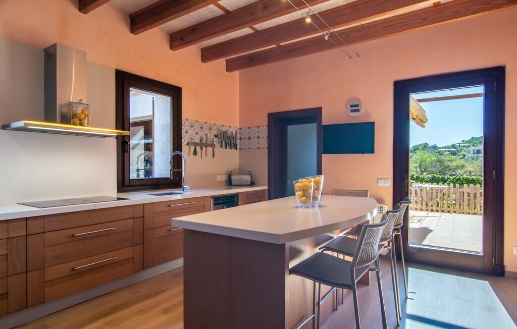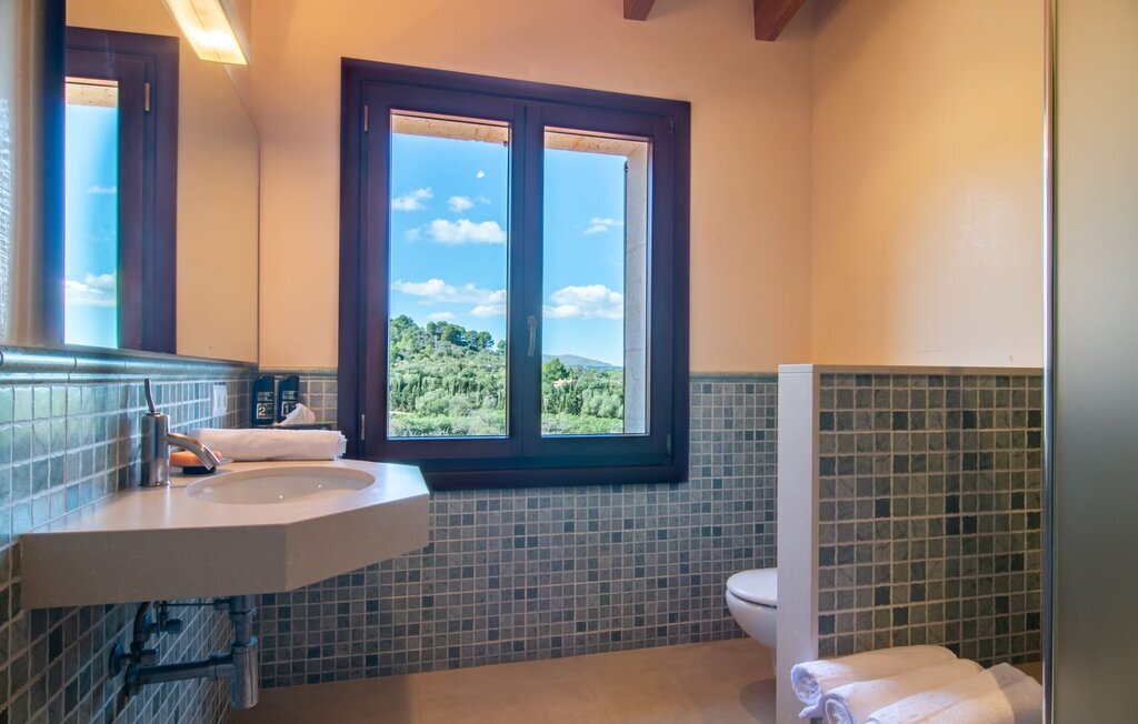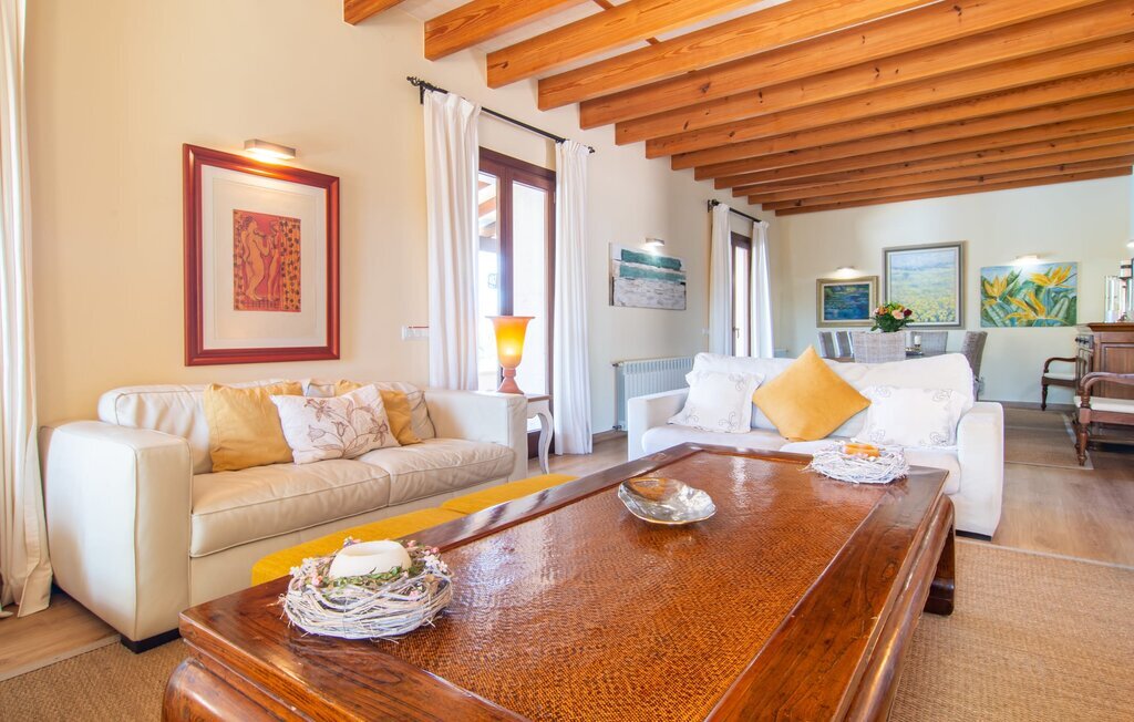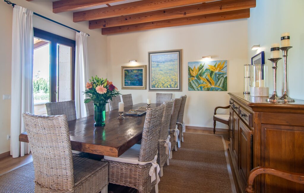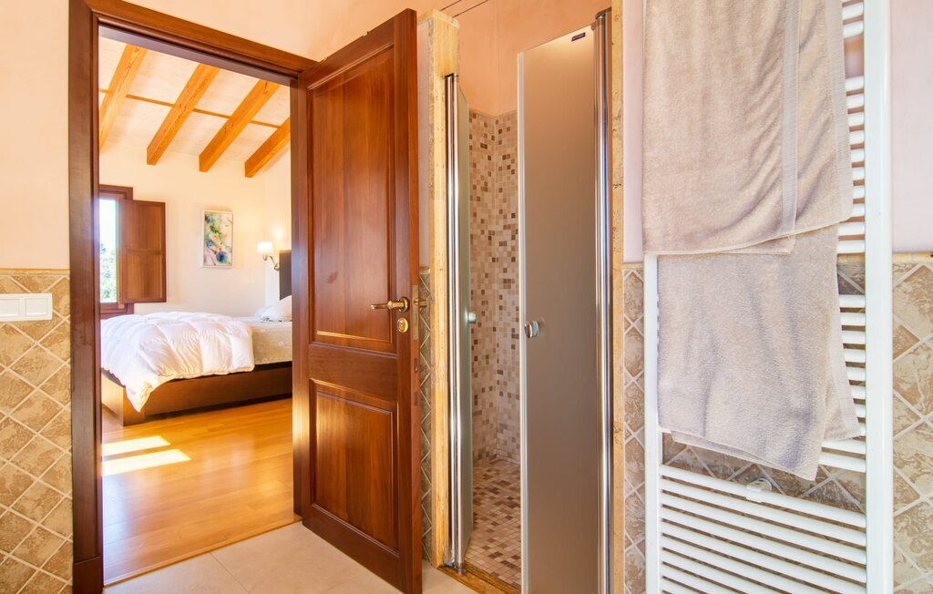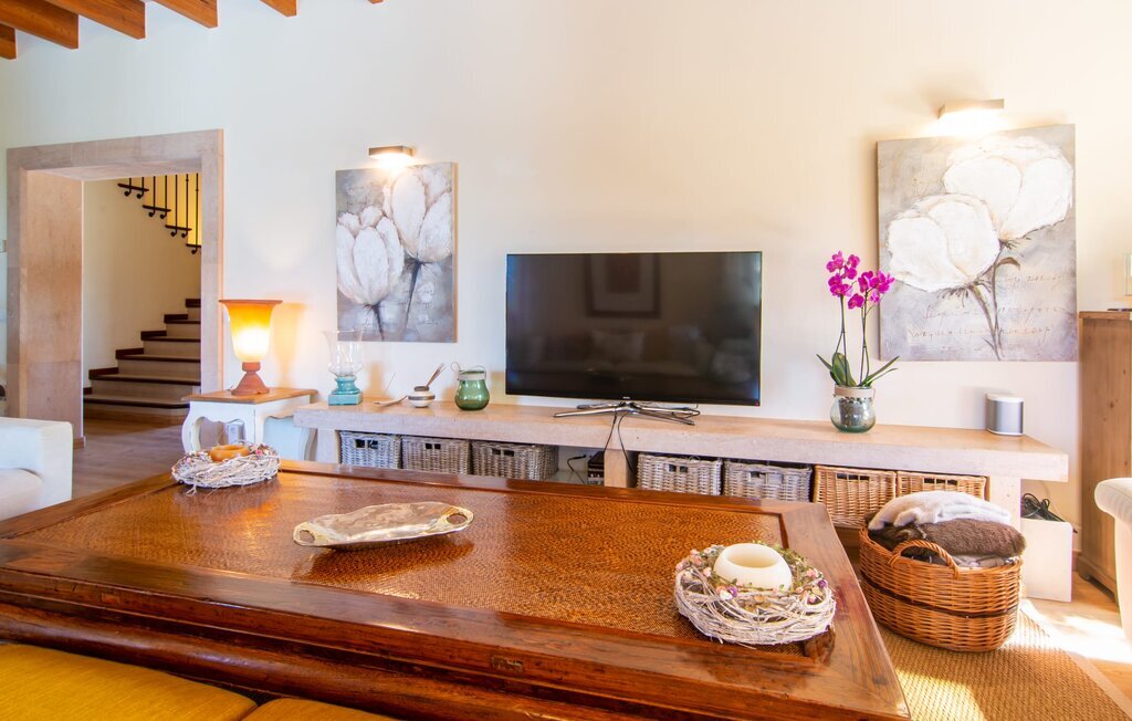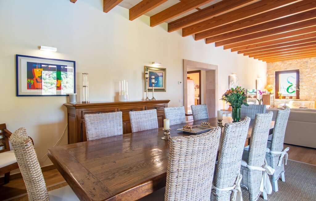 Il est maintenant temps d'entrer dans cette villa accueillante qui ne manquera pas de vous impressionner. Vous entrez tout d'abord dans le salon confortable avec une salle à manger adjacente - les meubles et la décoration sont de style campagnard moderne et sont complétés par des moments de tradition typiquement majorquine. La cuisine entièrement équipée avec ses façades en bois foncé est dotée de toutes les commodités techniques dont vous avez besoin pour faire de l'autosuffisance un jeu d'enfant. L'îlot central avec ses tabourets sert de centre communicatif lorsque vous cuisinez ensemble. Depuis les chambres à coucher, vous avez non seulement une vue apaisante sur la nature, mais vous pouvez également profiter d'une nuit de sommeil réparatrice. Cette villa est idéale pour deux familles avec enfants ou pour de bons amis qui souhaitent simplement passer plus de temps ensemble. Les chambres doubles sont réparties sur deux étages et deux d'entre elles disposent d'une confortable salle de bains en suite. Une troisième salle de bains, également carrelée de façon moderne, est partagée. Comme il y a un WC supplémentaire pour les invités, vous pouvez éviter les éventuels conflits de salle de bains pendant vos vacances.