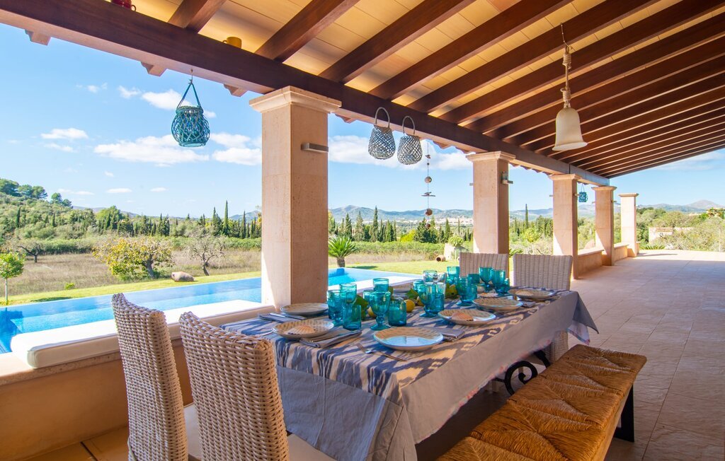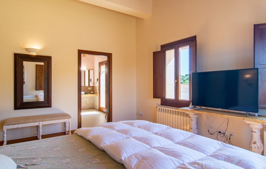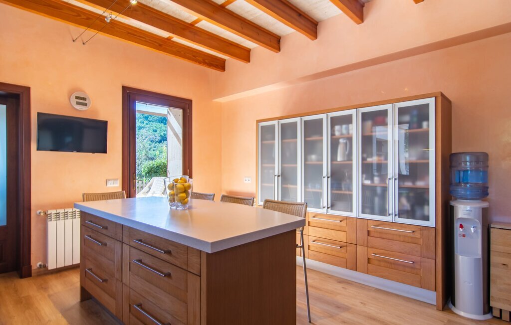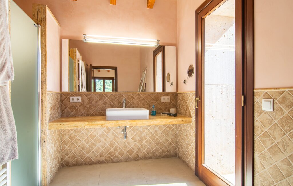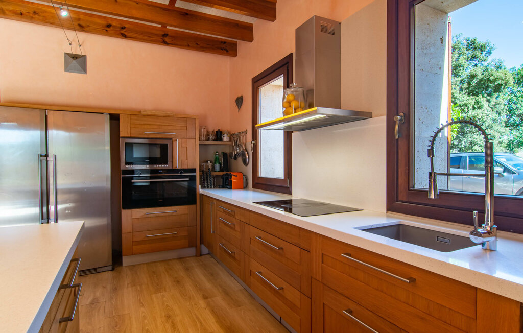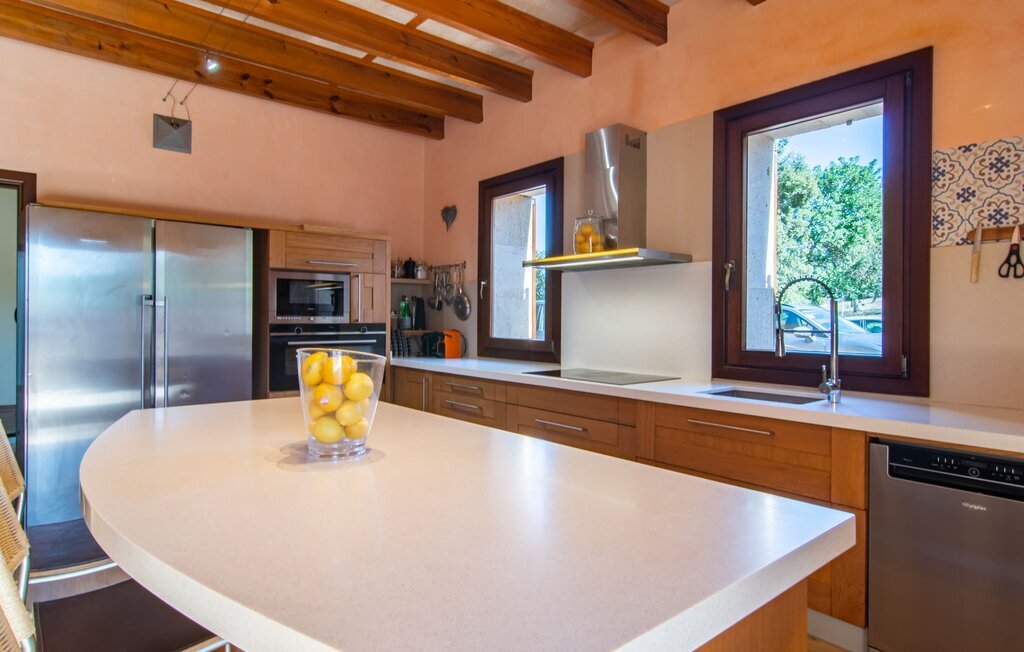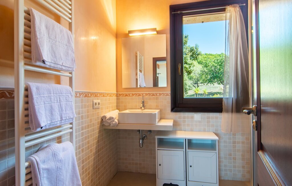 Il est maintenant temps d'entrer dans cette villa accueillante qui ne manquera pas de vous impressionner. Vous entrez tout d'abord dans le salon confortable avec une salle à manger adjacente - les meubles et la décoration sont de style campagnard moderne et sont complétés par des moments de tradition typiquement majorquine. La cuisine entièrement équipée avec ses façades en bois foncé est dotée de toutes les commodités techniques dont vous avez besoin pour faire de l'autosuffisance un jeu d'enfant. L'îlot central avec ses tabourets sert de centre communicatif lorsque vous cuisinez ensemble. Depuis les chambres à coucher, vous avez non seulement une vue apaisante sur la nature, mais vous pouvez également profiter d'une nuit de sommeil réparatrice. Cette villa est idéale pour deux familles avec enfants ou pour de bons amis qui souhaitent simplement passer plus de temps ensemble. Les chambres doubles sont réparties sur deux étages et deux d'entre elles disposent d'une confortable salle de bains en suite. Une troisième salle de bains, également carrelée de façon moderne, est partagée. Comme il y a un WC supplémentaire pour les invités, vous pouvez éviter les éventuels conflits de salle de bains pendant vos vacances.