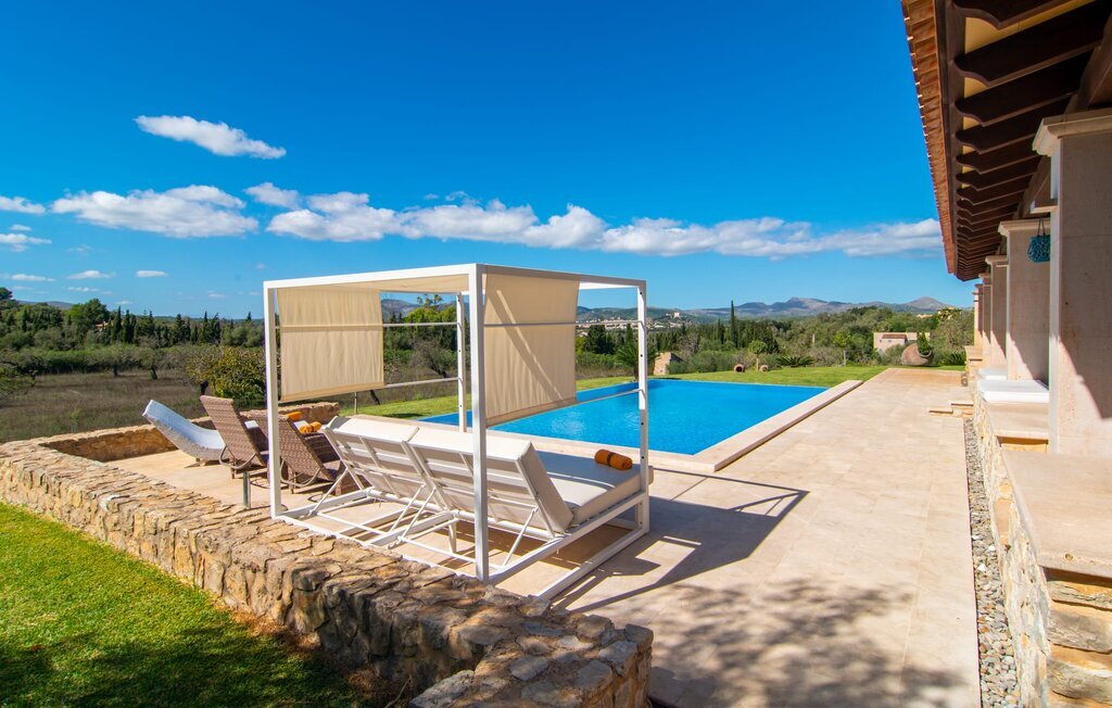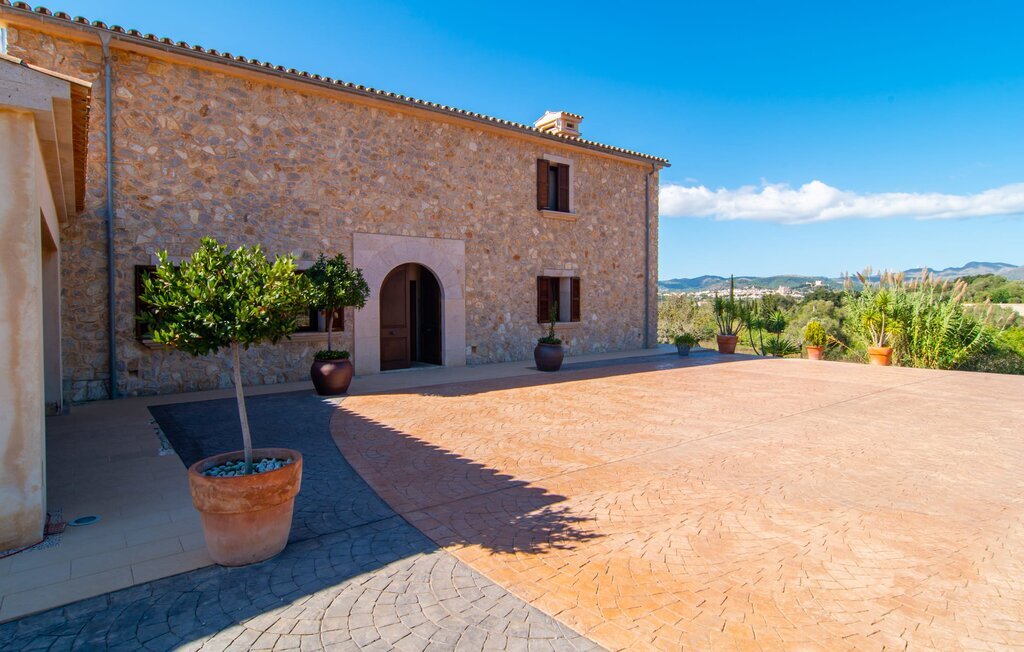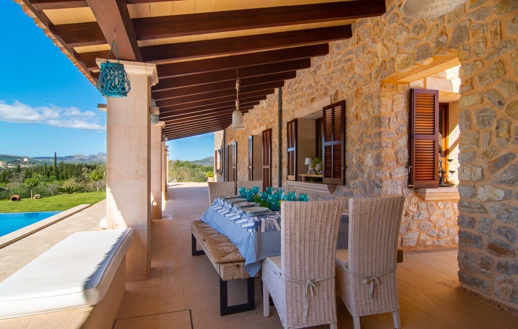 La vue magnifiquement dégagée depuis la propriété de la villa rurale Sa Corbaia distingue cette impressionnante bâtisse de la masse. Située sur les hauteurs d'une vaste propriété marquée par la faune méditerranéenne, cette maison en pierre de taille de deux étages rayonne de charme avec une tranquillité absolue. Laissez votre regard errer sur les prairies jusqu'à Artà au loin - la vue est exceptionnelle, aussi bien le matin avec la douce silhouette des collines que le soir. Vous pouvez également profiter de ce panorama depuis la terrasse couverte, située deux marches au-dessus du niveau du jardin. Vous pouvez prendre vos repas ensemble autour d'une longue table à manger. La cuisine extérieure avec barbecue vous aidera à préparer un délicieux repas. La piscine à débordement devant la véranda garantit un sentiment de bien-être dans la nature et un luxe sans prétention. Elle ne séduit pas seulement par sa taille impressionnante, mais offre aussi, grâce à l'eau salée, une expérience de baignade particulièrement douce pour la peau. La douche extérieure semi-circulaire avec des carreaux en mosaïque est bien sûr particulièrement pratique pour s'offrir une sieste sur les chaises longues disponibles ou sur le lit balinais chic juste après la baignade. Le dernier point fort est sans aucun doute le balcon ensoleillé et protégé à l'étage supérieur, à côté de la chambre à coucher principale.