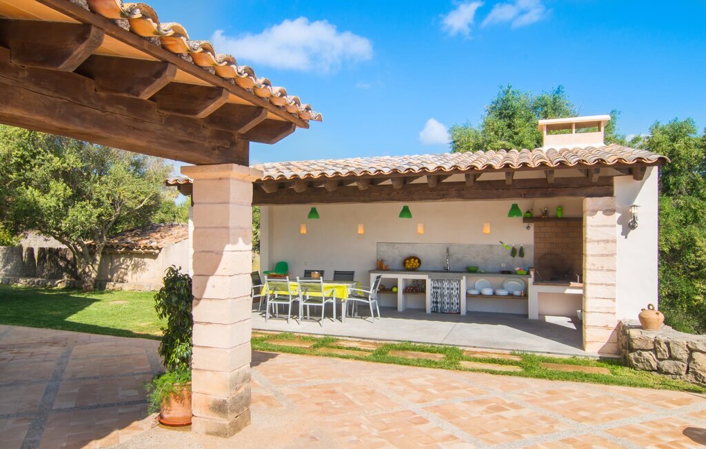 Si vous recherchez avant tout le calme et la tranquillité pendant vos vacances, vous êtes au bon endroit et vous le remarquerez dès votre arrivée : Des deux côtés de l'allée menant à la maison, des moutons satisfaits broutent paisiblement Villa en pierre naturelle merveilleusement rurale Escanellas. Cette maison de campagne construite dans le style majorquin avec de jolis volets verts se trouve sur un immense domaine près de la ville d'Artà. Elle offre plus qu'une pelouse bien entretenue où les enfants peuvent jouer, mais aussi une combinaison enchanteresse de pins, de grands conifères et d'arbustes délicieusement parfumés, typiques de la végétation de l'île. Depuis la terrasse partiellement couverte, à la fois chic et confortable et équipée de plusieurs groupes de canapés, vous pourrez profiter d'une vue fantastique sur les environs de cette région côtière à perte de vue. Détendez-vous sur le canapé en rotin, coussins inclus, ou savourez des délices méditerranéens autour de la grande table à manger. Une autre terrasse couverte, juste à côté du bâtiment principal, offre également de la place pour les repas ; en plus d'une table et de chaises, elle dispose d'un évier pratique ainsi que de plusieurs étagères et plans de travail pour la préparation de petits snacks en plein air, comme une salade de fruits frais par exemple. Si vous avez besoin de vous rafraîchir, faites quelques brasses dans la piscine aux reflets turquoise sous le soleil, puis réchauffez-vous rapidement sur l'une des chaises longues.