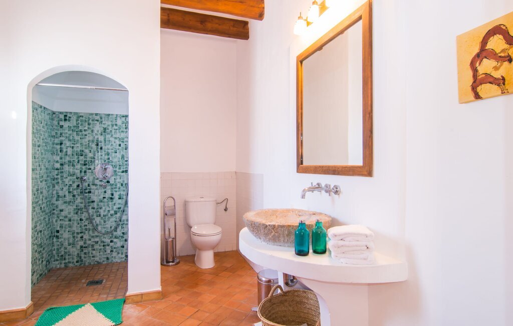 À l'intérieur aussi, la villa dégage un charme typiquement majorquin : des poutres en bois sombres et des arcs en pierre relient les pièces, tandis que les plafonds, agrémentés à certains endroits d'arrondis raffinés en pierre de Mares, et les jolis carreaux de sol créent une atmosphère rustique et pourtant intime très propre, ambiance. On peut entrer dans cette maison élégante de deux côtés : soit dans un impressionnant foyer de plus de 8 mètres de haut, soit directement dans le spacieux salon/salle à manger. Il abrite une longue table en bois pour des soirées inoubliables avec de délicieux repas et des débats animés, ainsi que des canapés confortables pour se détendre devant un film passionnant. Juste à côté, vous trouverez une cuisine ouverte, moderne et entièrement équipée, qui a néanmoins un caractère campagnard grâce à des éléments intégrés avec amour : par exemple le bel évier en briques ou l'aga délicieusement chaud. Ceux qui sont fatigués par les émotions de la journée peuvent se retirer dans l'une des quatre chambres doubles. L'une d'entre elles se trouve au rez-de-chaussée, tandis que les autres se trouvent à l'étage et sont accessibles par un superbe escalier en bois. Elles sont toutes lumineuses et agréables jusque dans les moindres détails et garantissent ainsi de doux rêves. L'une des chambres se trouve dans les combles et ne dispose pas de serrure, ce qui la rend parfaite pour deux enfants. L'un des points forts des trois salles de bains de la villa sont les carreaux et les murs individuels aux couleurs méditerranéennes ainsi que les zones de douche et de baignoire maçonnées. Elle vous donnera certainement la merveilleuse sensation de vivre une expérience spa à la maison.