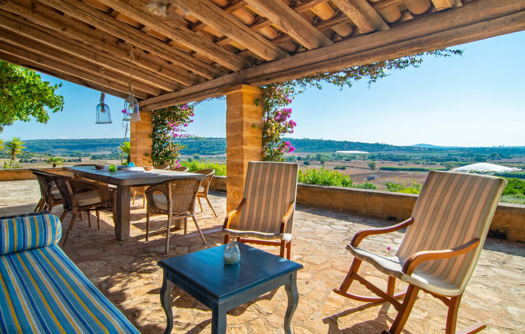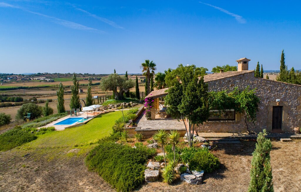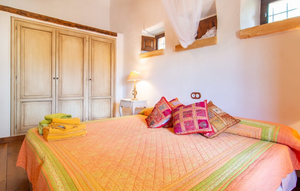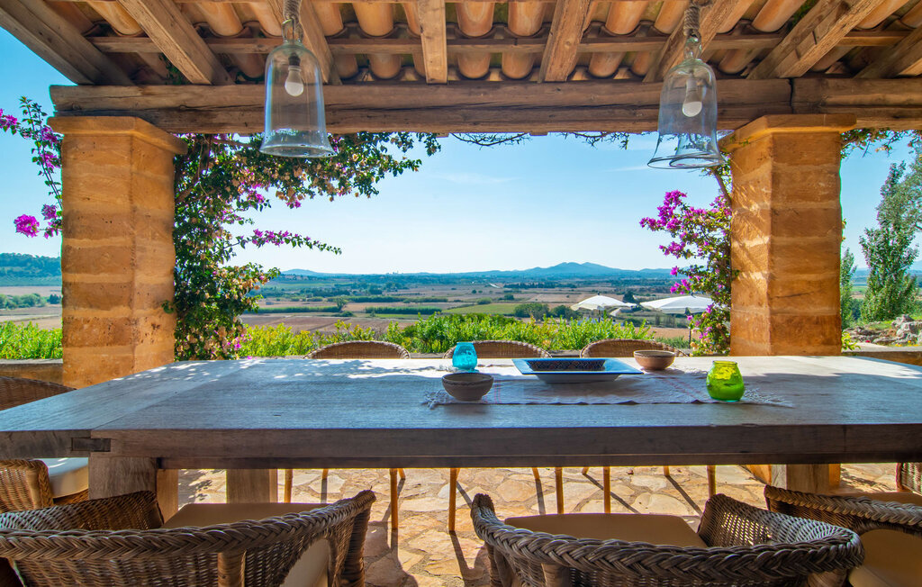 Légèrement surélevé, Es Turó domine les douces collines du magnifique paysage du centre de l'île. Depuis la charmante villa en pierres naturelles, quelques marches descendent vers la petite terrasse de la piscine. En barbotant, en prenant un bain de soleil sur les chaises longues ou en prenant le petit déjeuner à la petite table, vous pouvez à tout moment profiter de la vue inestimable sur le lointain. Entourée de palmiers et de cyprès, l'agréable atmosphère méditerranéenne que vous recherchez en vacances s'installe automatiquement. Une autre caractéristique fantastique est la cuisine extérieure rustique, entourée de pavés et d'une belle pergola. Avec quelques ingrédients frais du marché voisin, vous aurez tous les plaisirs culinaires dont vous avez besoin. Sur la terrasse couverte, décorée dans des tons verts et violets accueillants, vous pouvez savourer une boisson fraîche sur des chaises en osier ou à bascule et sur le joyeux canapé bleu, ou simplement profiter de l'environnement paisible.