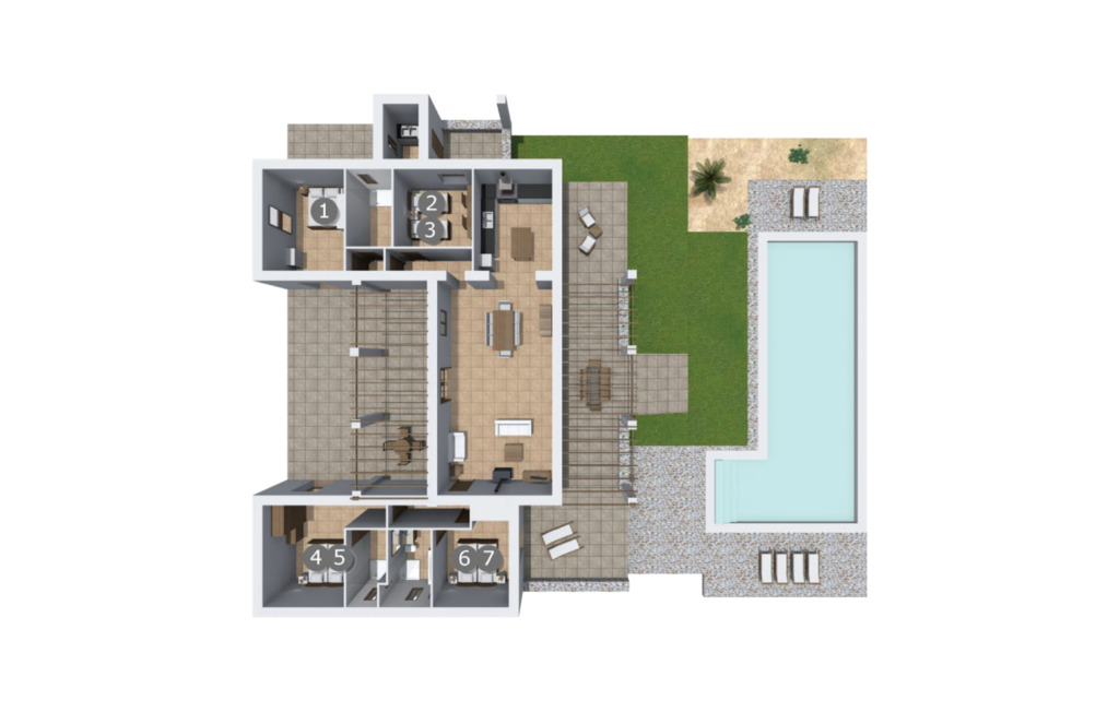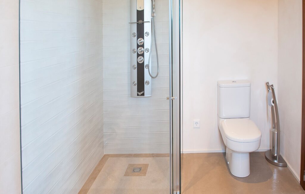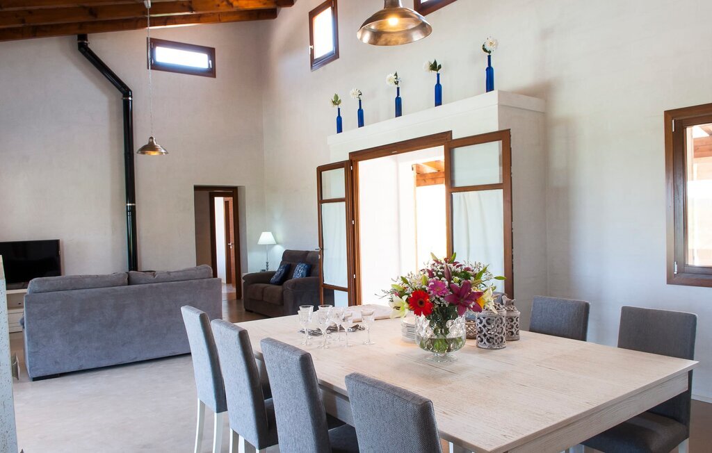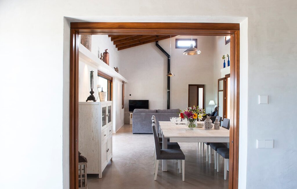 Pour rendre la vie en communauté encore plus agréable, l'intérieur de cette villa tendance est accessible des deux côtés : soit par de grandes portes vitrées du côté de la piscine, soit par les grandes portes vitrées du côté de la terrasse. Cela rend la maison particulièrement aérée et assure un flux naturel de l'extérieur vers l'intérieur. La villa puriste dispose d'un sol en béton vitré et d'un aspect particulièrement moderne et tendance avec des passages lisses. Un coin salon accueillant se trouve devant la télévision LCD moderne et la cheminée confortable du salon. Dans une autre partie de la pièce se trouve une table en bois clair pouvant accueillir jusqu'à huit personnes. Les fauteuils gris à dossier haut offrent des sièges confortables. L'ameublement est discrètement gracieux, dans le style d'un cottage moderne. De nombreux meubles sont peints en blanc et la décoration typiquement majorquine complète le look cottage avec un flair nostalgique. L'accès à la spacieuse cuisine/salle à manger se fait par un grand passage encadré de bois. Il y a une cuisine blanche entièrement équipée avec un réfrigérateur-congélateur. Les meubles de cuisine intégrés sont ici complétés par un meuble vertical rustique qui ressemble à une cuisine paysanne confortable et intime, même si l'ensemble de l'équipement est à la pointe de la technologie. La forme en U de la maison offre deux espaces de couchage de part et d'autre de la zone commune. D'un côté, il y a une grande chambre pour les parents et une chambre d'enfant typique avec un joyeux lit double, comme une aile parents-enfants avec une salle de bain chic. Dans l'autre aile, il y a en plus deux chambres et deux salles de bains, dont l'une est équipée d'une salle de bains ultramoderne. Les chambres à coucher sont équipées d'une jolie literie dans le style du cottage légèrement romantique de la maison. Les salles de bains sont particulièrement raffinées. Deux des salles de bains disposent d'une douche de plain-pied et d'une douche latérale. En outre, il y a une douche séparée au-dessus de la baignoire avec des carreaux en pierre naturelle. Nous apprécions particulièrement le lavabo encastré dans la pierre et le miroir en bois flotté sans cadre. Ce sont des détails élégants et discrets présents dans toute la propriété qui donnent du charme à cette villa neuve.