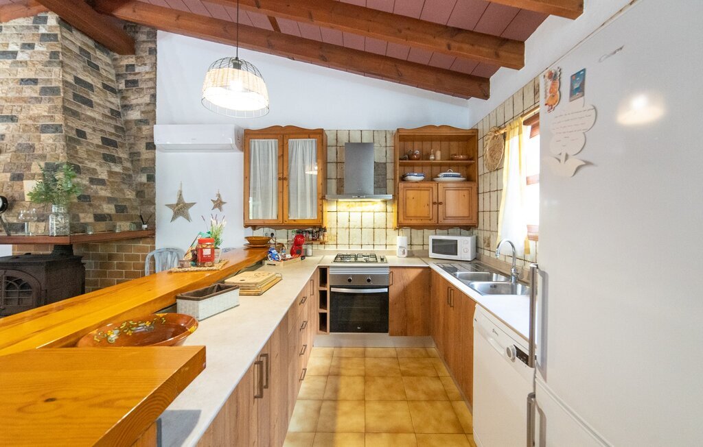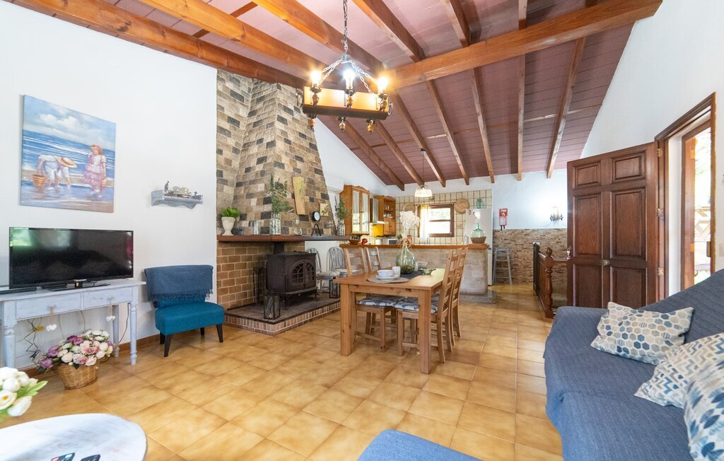 À l'intérieur, l'espace de vie s'étend sur deux niveaux. L'entrée principale donne accès au niveau supérieur, qui comprend un espace de vie ouvert avec cheminée, un coin repas et une cuisine spacieuse entièrement équipée. La zone dispose de la climatisation chaud/froid. Un escalier permet de descendre à l'étage inférieur. Grâce à la situation en pente, les trois chambres doubles ont également une vue sur le jardin. Les trois espaces de couchage soignés se partagent une salle de bain moderne avec douche. La maison est équipée de radiateurs, ce qui permet aux randonneurs et aux cyclistes de trouver un refuge confortable après de longues randonnées.