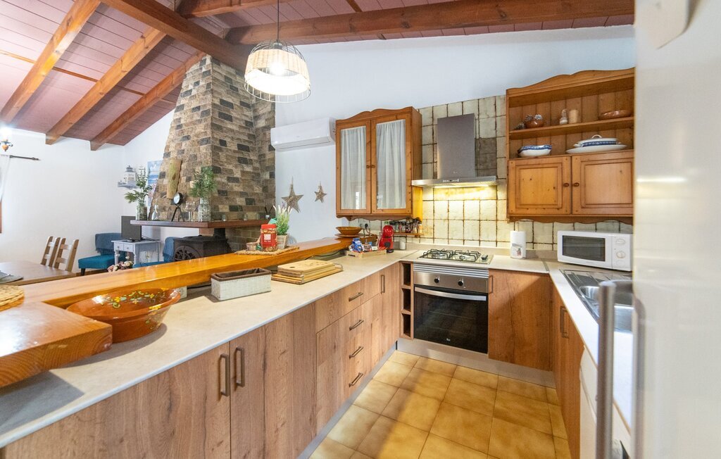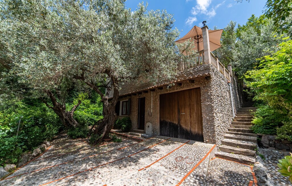 Des oliviers ancestraux et des plantes d'un vert juteux forment une jungle ombragée autour des terrasses intimes du terrain en pente, où il est facile de se détendre. Même pendant les chauds mois d'été. L'accès à la propriété se fait par une allée et par les deux terrasses à l'avant de la maison. Alors que la première terrasse offre un coin repas rustique à l'ombre d'une végétation luxuriante, la deuxième terrasse offre une vue imprenable sur l'impressionnant front de montagne. Le jardin offre un barbecue en brique, une zone ensoleillée et protégée avec des chaises longues et plusieurs autres espaces de repas confortables.