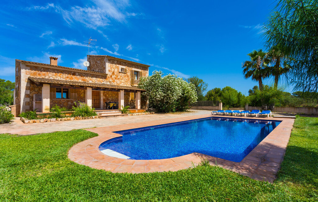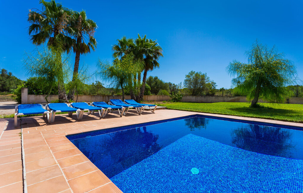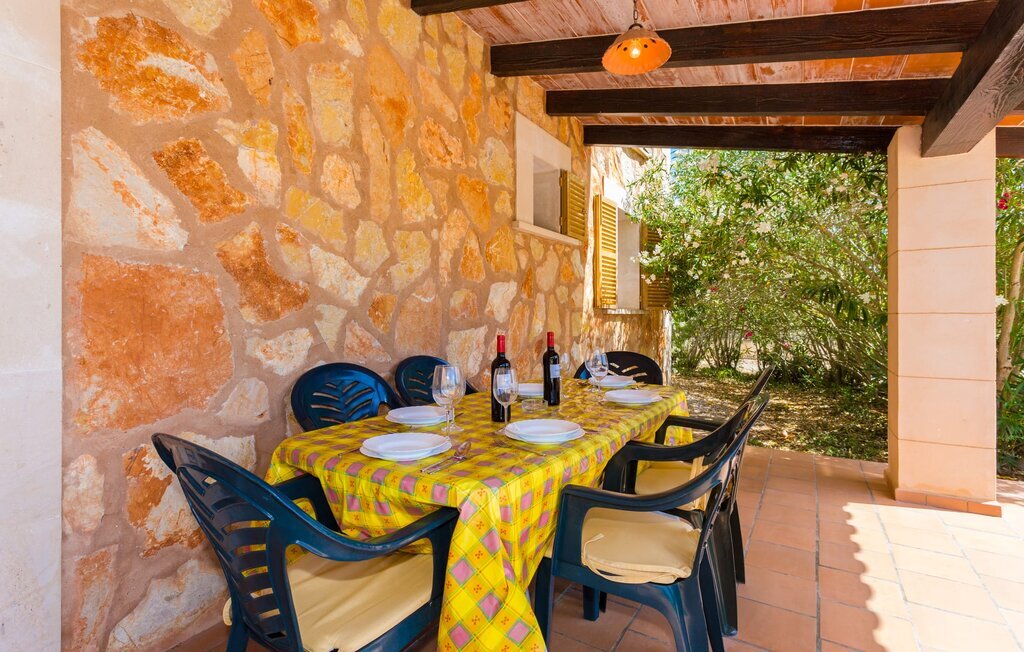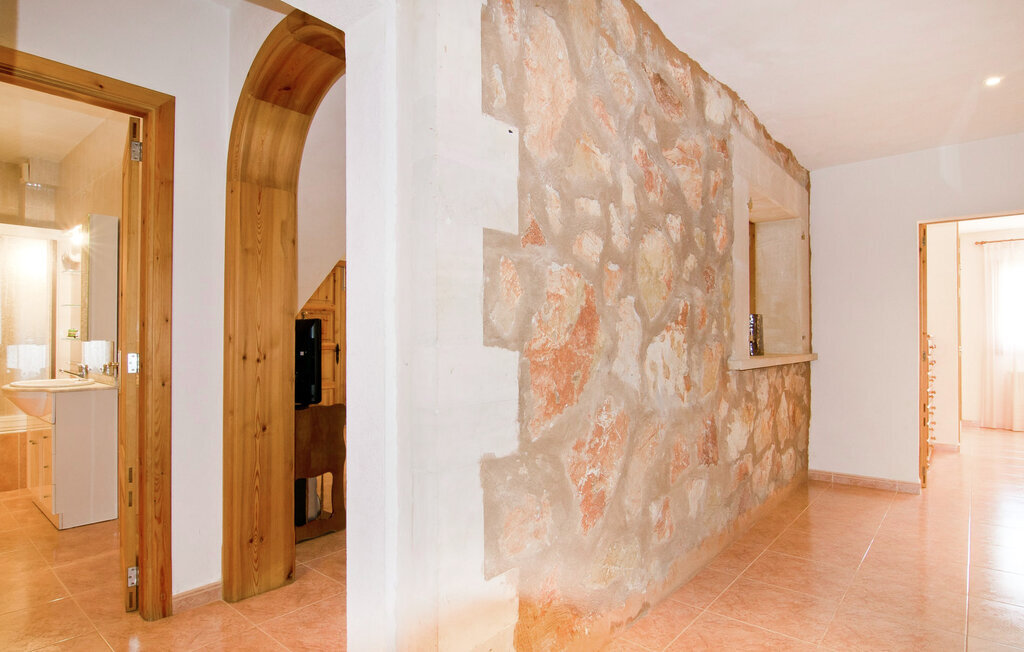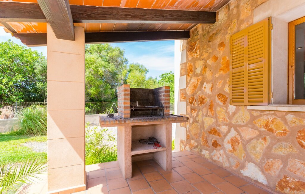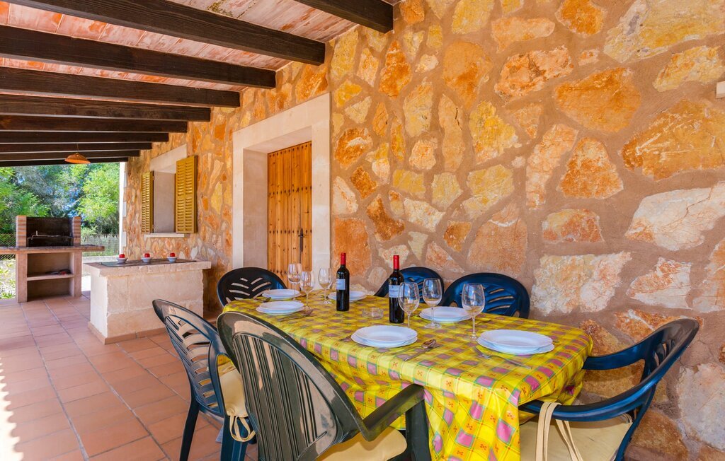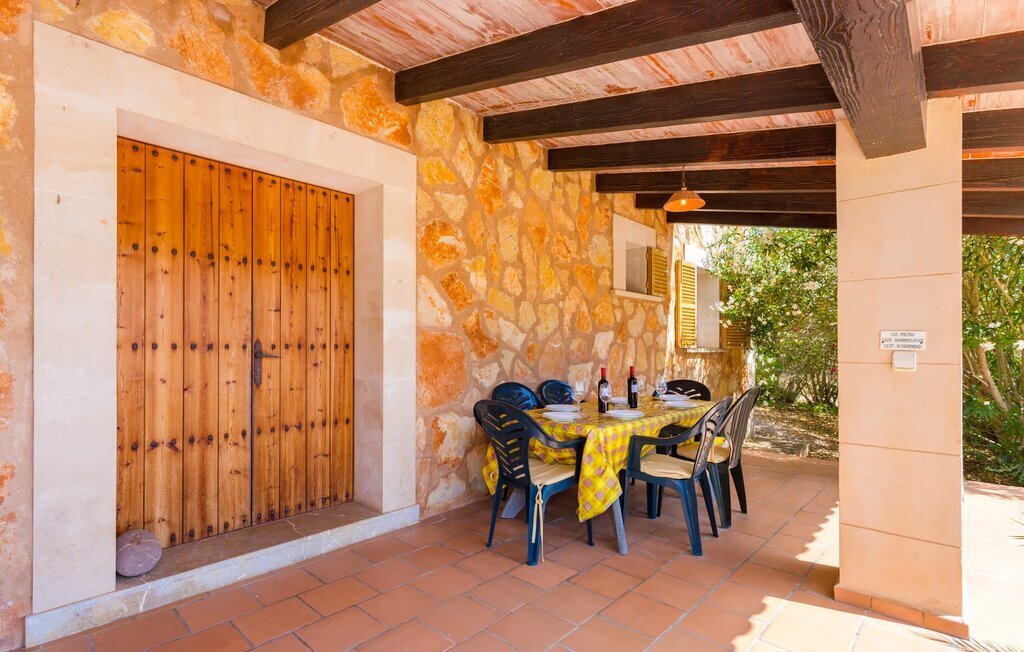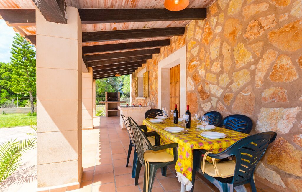 La villa Es Figueral près de Campos accueille ses hôtes dans un cadre idyllique, entouré d'un petit mur et d'un domaine méditerranéen. L'espace extérieur est principalement caractérisé par de vastes terrasses, des pelouses et des surfaces de gravier, sur lesquelles vous trouverez une multitude d'endroits magnifiques pour vous détendre. La pelouse est idéale pour accompagner les enfants dans leurs jeux et les aménagements extérieurs autour de la maison assurent un séjour formidable Possibilité de jouer à cache-cache et autres jeux en plein air. La piscine de 10 m de long attire l'attention avec ses tesselles d'un bleu éclatant et son entrée semi-circulaire et large avec escalier qui permet d'accéder facilement au bassin. Des chaises longues confortables sont à votre disposition pour prendre de longs bains de soleil sous le ciel bleu de la Méditerranée. Ici, vous pouvez vous détendre à cœur joie et laisser le stress quotidien derrière vous. Trois marches vous mèneront à la terrasse couverte, qui offre un point de vue magnifique et aéré. Par beau temps, vous pouvez prendre tous vos repas autour de la table à manger et profiter ensemble de la vue sur la verdure. Le matin, il est particulièrement agréable d'y faire des projets pour la journée à venir. La véranda est tout aussi attrayante lors d'une douce soirée, que vous pouvez passer à faire un bon barbecue. Le superbe barbecue intégré est là pour vous aider. Vous pouvez préparer des ingrédients frais et régionaux à votre goût et les déguster ensuite.