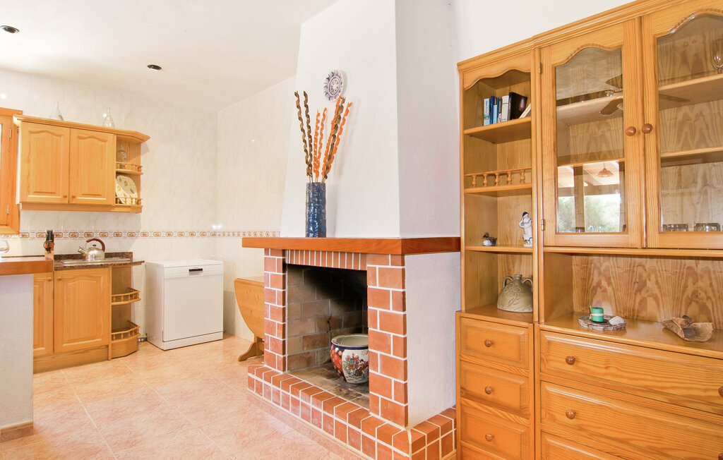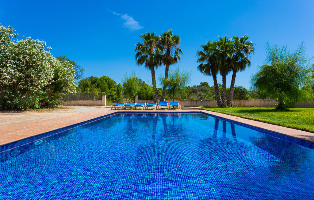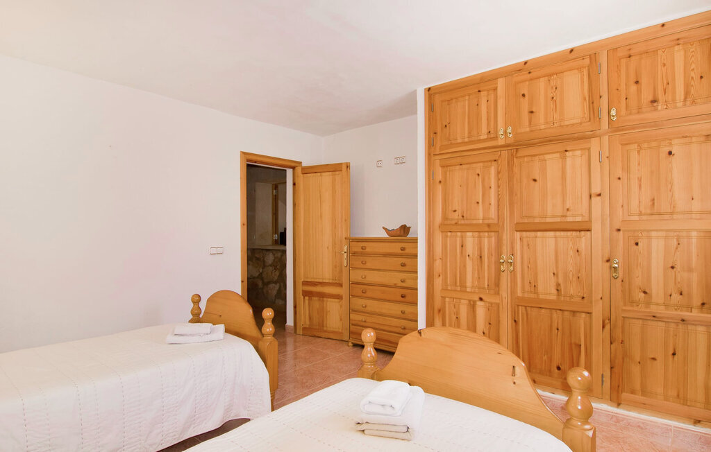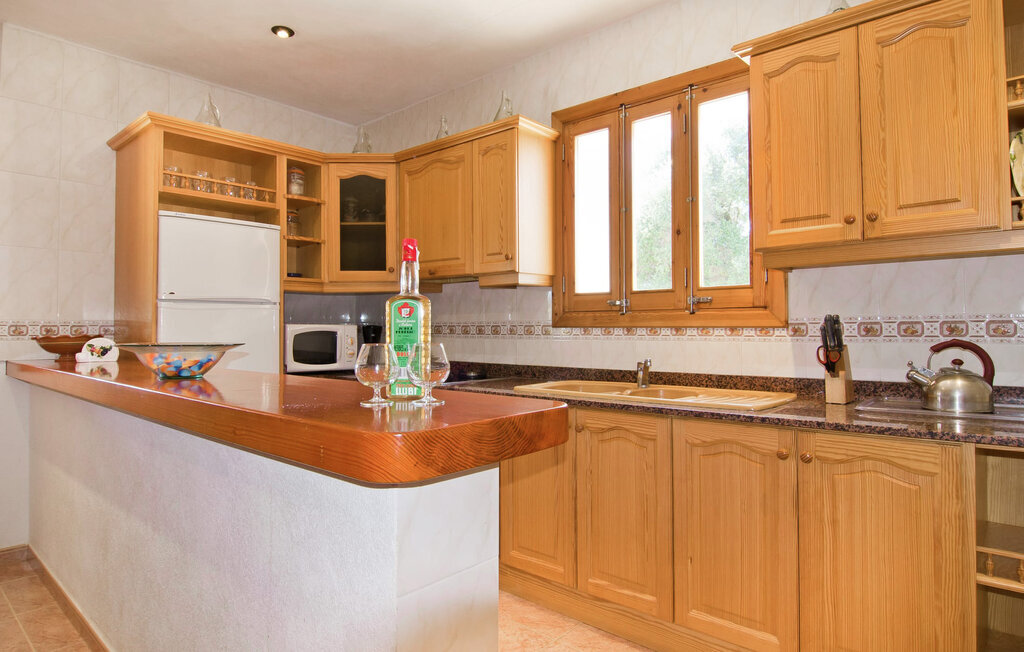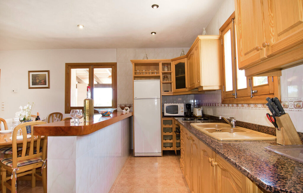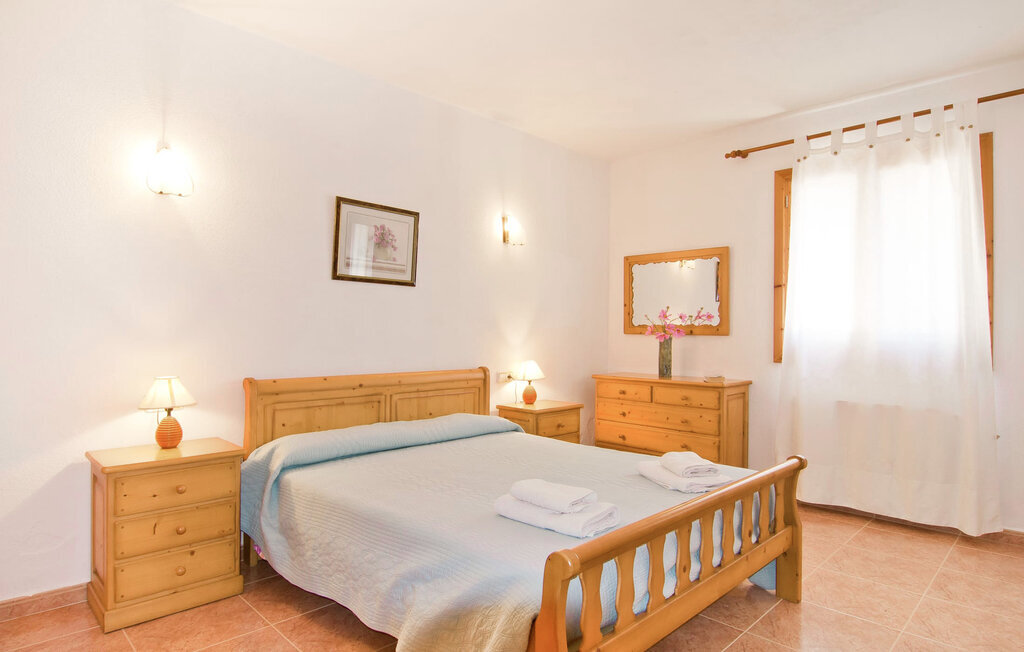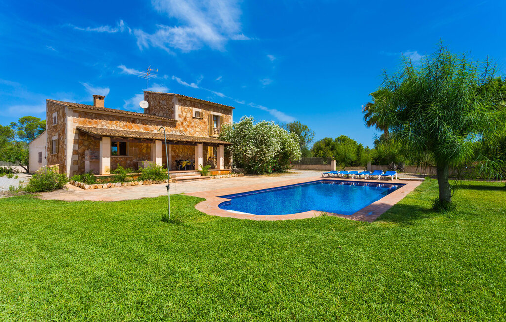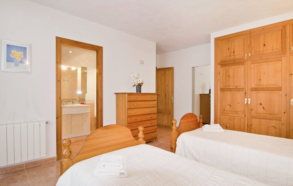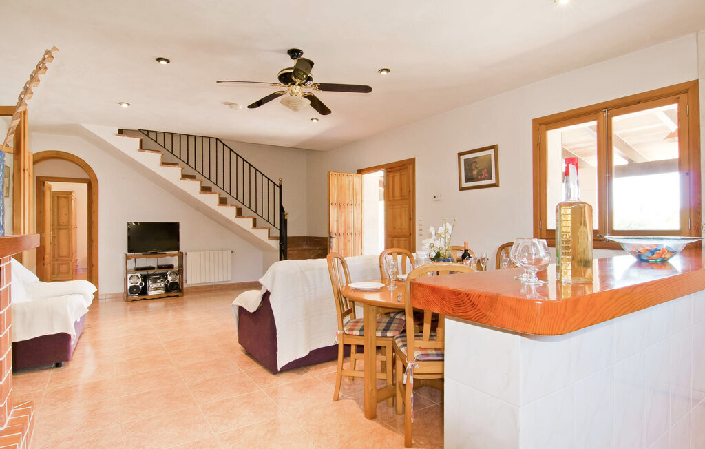 La villa Es Figueral près de Campos accueille ses hôtes dans un cadre idyllique, entouré d'un petit mur et d'un domaine méditerranéen. L'espace extérieur est principalement caractérisé par de vastes terrasses, des pelouses et des surfaces de gravier, sur lesquelles vous trouverez une multitude d'endroits magnifiques pour vous détendre. La pelouse est idéale pour accompagner les enfants dans leurs jeux et les aménagements extérieurs autour de la maison assurent un séjour formidable Possibilité de jouer à cache-cache et autres jeux en plein air. La piscine de 10 m de long attire l'attention avec ses tesselles d'un bleu éclatant et son entrée semi-circulaire et large avec escalier qui permet d'accéder facilement au bassin. Des chaises longues confortables sont à votre disposition pour prendre de longs bains de soleil sous le ciel bleu de la Méditerranée. Ici, vous pouvez vous détendre à cœur joie et laisser le stress quotidien derrière vous. Trois marches vous mèneront à la terrasse couverte, qui offre un point de vue magnifique et aéré. Par beau temps, vous pouvez prendre tous vos repas autour de la table à manger et profiter ensemble de la vue sur la verdure. Le matin, il est particulièrement agréable d'y faire des projets pour la journée à venir. La véranda est tout aussi attrayante lors d'une douce soirée, que vous pouvez passer à faire un bon barbecue. Le superbe barbecue intégré est là pour vous aider. Vous pouvez préparer des ingrédients frais et régionaux à votre goût et les déguster ensuite.