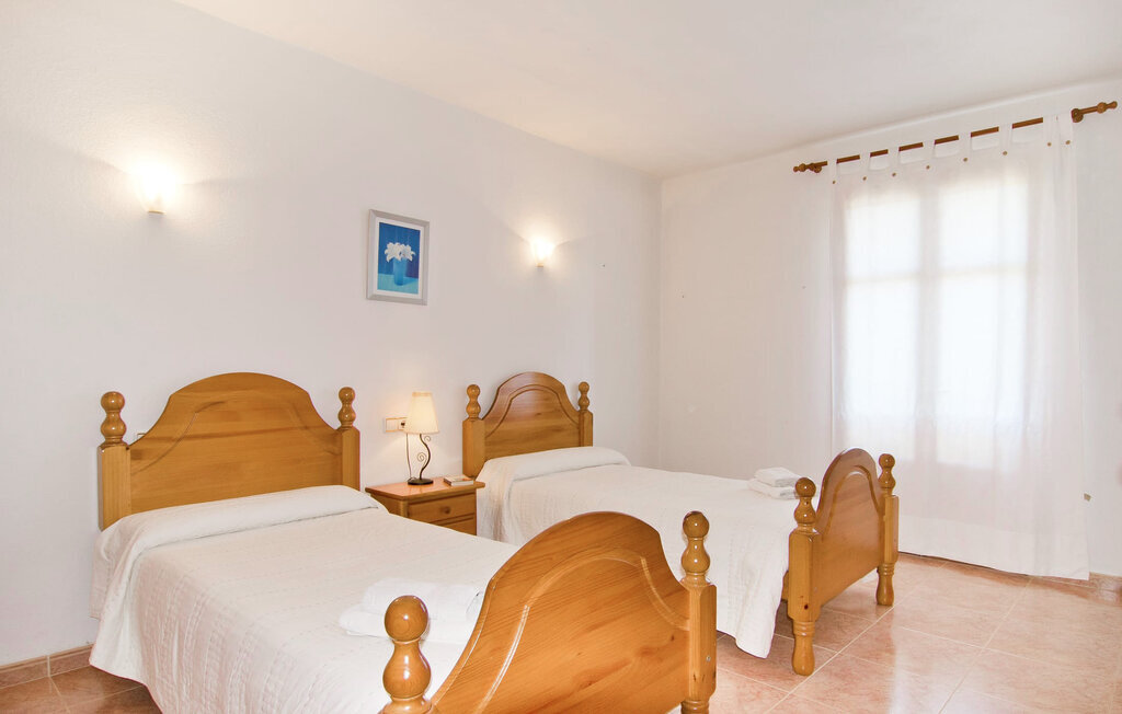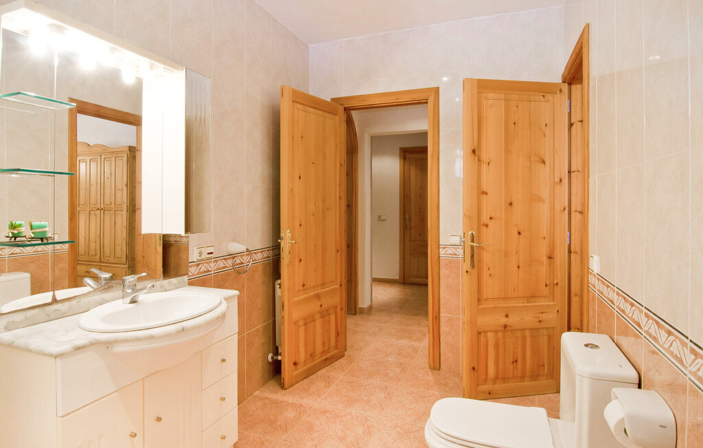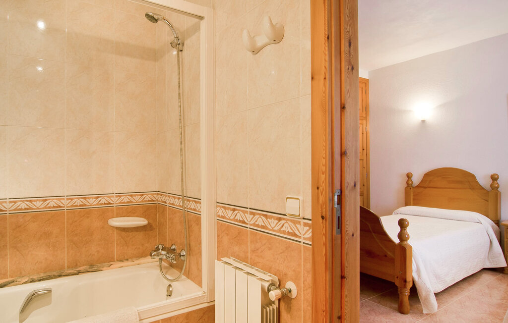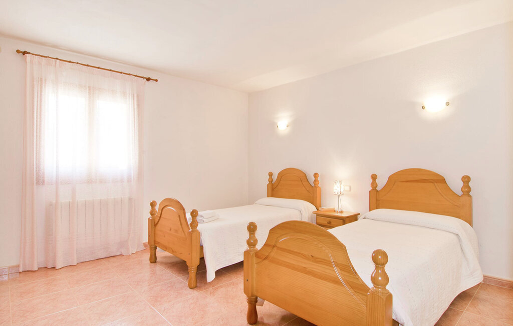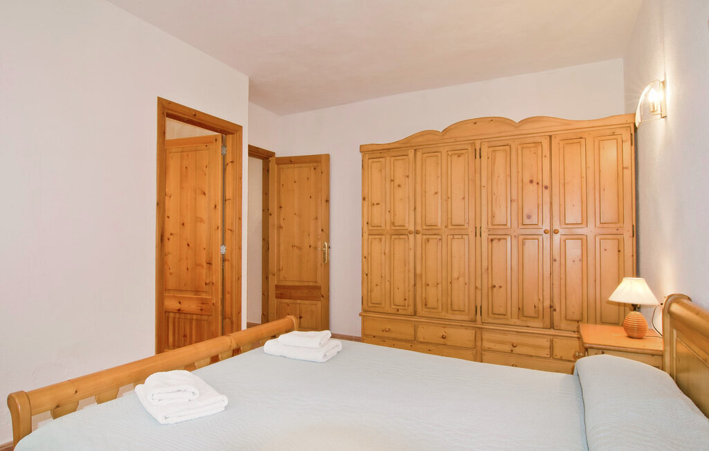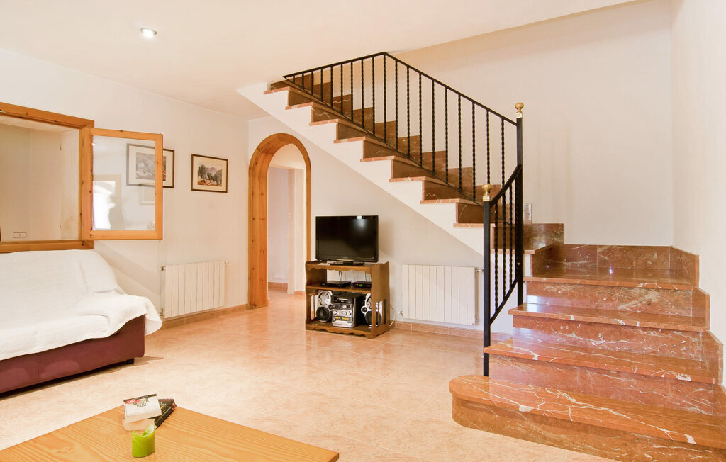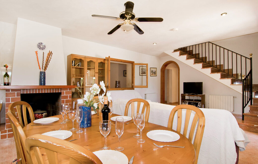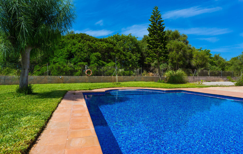 La villa Es Figueral près de Campos accueille ses hôtes dans un cadre idyllique, entouré d'un petit mur et d'un domaine méditerranéen. L'espace extérieur est principalement caractérisé par de vastes terrasses, des pelouses et des surfaces de gravier, sur lesquelles vous trouverez une multitude d'endroits magnifiques pour vous détendre. La pelouse est idéale pour accompagner les enfants dans leurs jeux et les aménagements extérieurs autour de la maison assurent un séjour formidable Possibilité de jouer à cache-cache et autres jeux en plein air. La piscine de 10 m de long attire l'attention avec ses tesselles d'un bleu éclatant et son entrée semi-circulaire et large avec escalier qui permet d'accéder facilement au bassin. Des chaises longues confortables sont à votre disposition pour prendre de longs bains de soleil sous le ciel bleu de la Méditerranée. Ici, vous pouvez vous détendre à cœur joie et laisser le stress quotidien derrière vous. Trois marches vous mèneront à la terrasse couverte, qui offre un point de vue magnifique et aéré. Par beau temps, vous pouvez prendre tous vos repas autour de la table à manger et profiter ensemble de la vue sur la verdure. Le matin, il est particulièrement agréable d'y faire des projets pour la journée à venir. La véranda est tout aussi attrayante lors d'une douce soirée, que vous pouvez passer à faire un bon barbecue. Le superbe barbecue intégré est là pour vous aider. Vous pouvez préparer des ingrédients frais et régionaux à votre goût et les déguster ensuite.