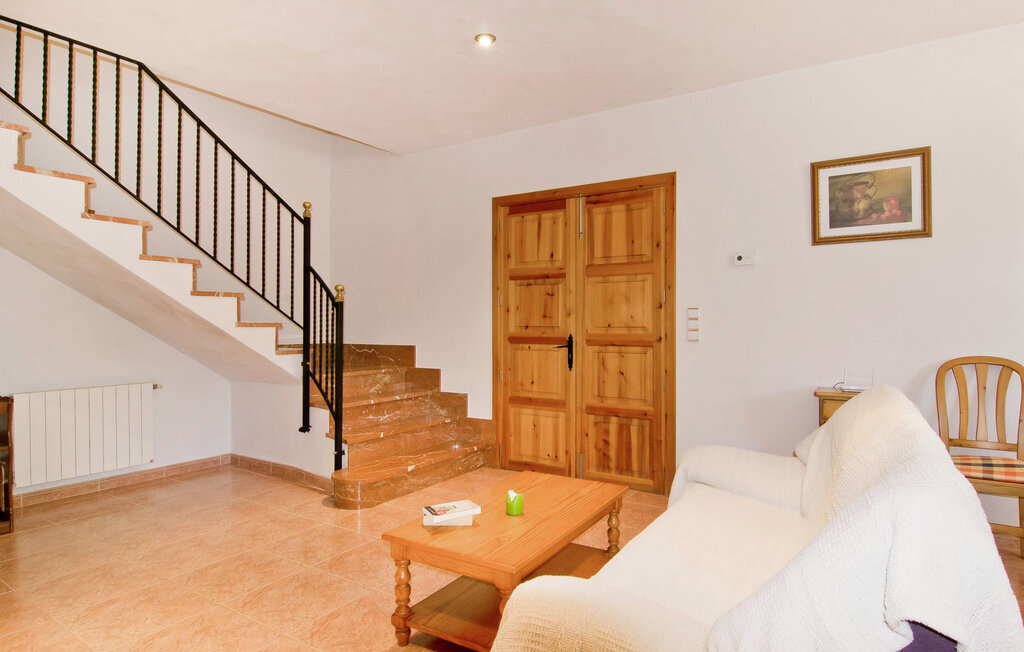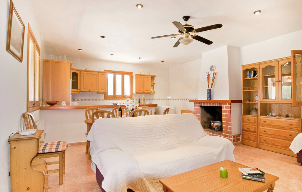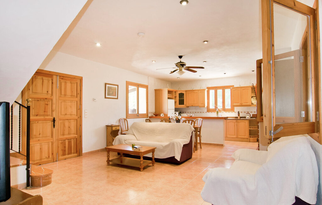 En passant par la terrasse, on accède de manière très classique directement au salon de la maison. Ici, vous êtes accueilli par des couleurs claires et beaucoup de bois, qui se marient harmonieusement avec les carreaux de sol ainsi que les fenêtres et les portes. Le salon/salle à manger combiné avec la cuisine intégrée offre deux canapés accueillants qui invitent à la détente. Ceux qui le souhaitent peuvent y écouter de la musique ou se laisser divertir par un bon film, car l'équipement technique y est confortablement installé. La table à manger située entre les canapés et la cuisine permet de partager un dîner d'intérieur de bon goût. Dans le coin cuisine, séparé du salon par un comptoir, vous trouverez tout le nécessaire pour l'usage quotidien, dont une machine à café italienne et une bouilloire. Lors des soirées fraîches, un feu contribue à rendre ce grand salon chaud et confortable. Les soirs chauds, le ventilateur de plafond diffuse une brise rafraîchissante. De là, vous accédez à l'étage supérieur de la maison par un joli escalier en marbre. Des chambres à coucher confortables et lumineuses, également aménagées avec beaucoup de bois, offrent une base idéale pour un sommeil réparateur. Un lit de 1,5 x 1,9 m ainsi que deux emplacements avec deux lits de 0,90 x 1,90 m chacun sont à disposition. Deux des chambres sont équipées de leur propre salle de bain. Une salle de bain est également accessible depuis le couloir. Vous n'avez pas à vous soucier d'apporter un sèche-cheveux de chez vous, car il est disponible sur place, tout comme un fer à repasser.
